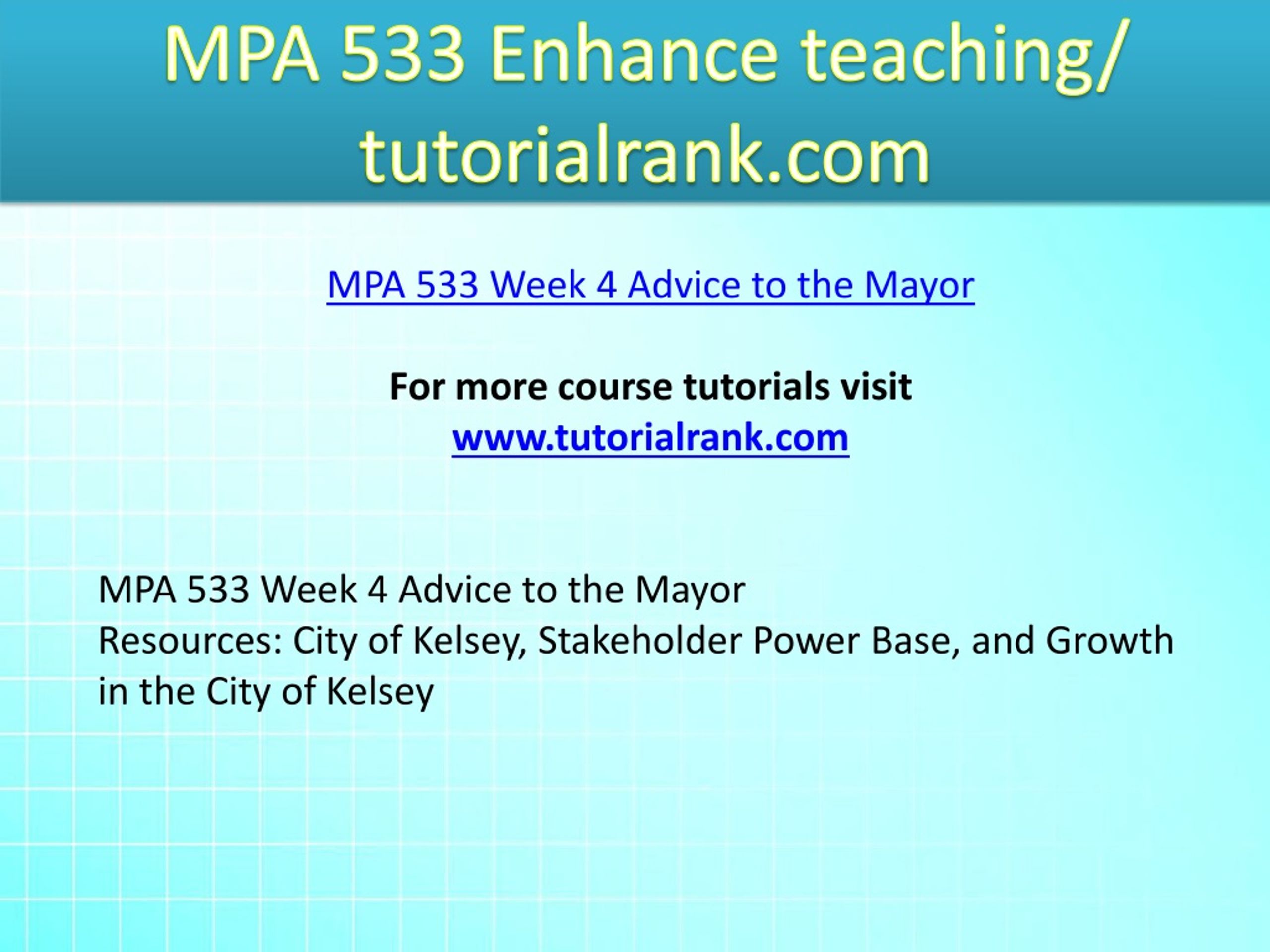 MPA 533 Enhance teaching/ tutorialrank.com MPA 533 Week 4 Advice to the Mayor For more course tutorials visit www.tutorialrank.com MPA 533 Week 4 Advice to the Mayor Resources: City of Kelsey, Stakeholder Power Base, and Growth in the City of Kelsey