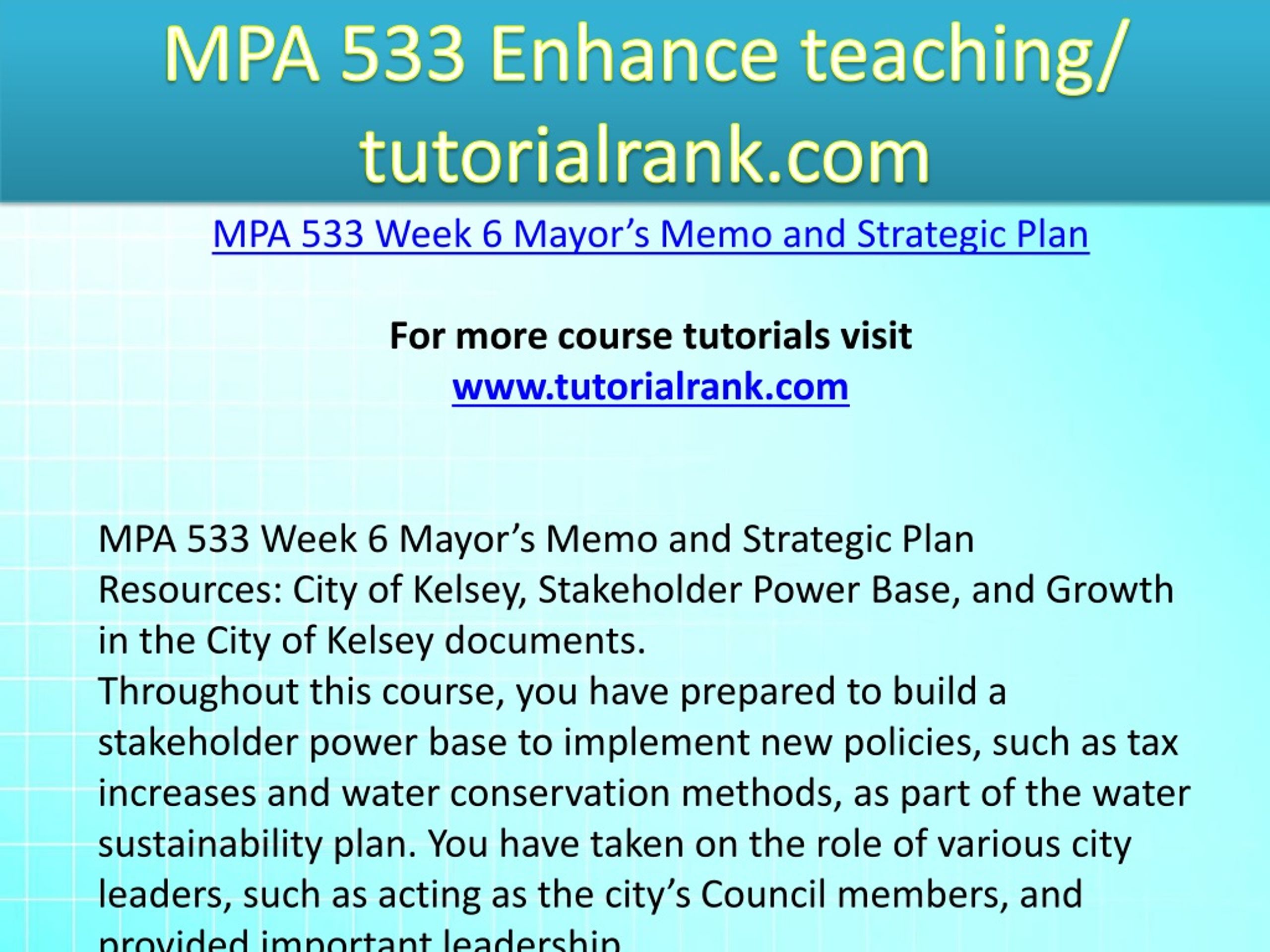 MPA 533 Enhance teaching/ tutorialrank.com MPA 533 Week 6 Mayor’s Memo and Strategic Plan For more course tutorials visit www.tutorialrank.com MPA 533 Week 6 Mayor’s Memo and Strategic Plan Resources: City of Kelsey, Stakeholder Power Base, and Growth in the City of Kelsey documents. Throughout this course, you have prepared to build a stakeholder power base to implement new policies, such as tax increases and water conservation methods, as part of the water sustainability plan. You have taken on the role of various city leaders, such as acting as the city’s Council members, and provided important leadership