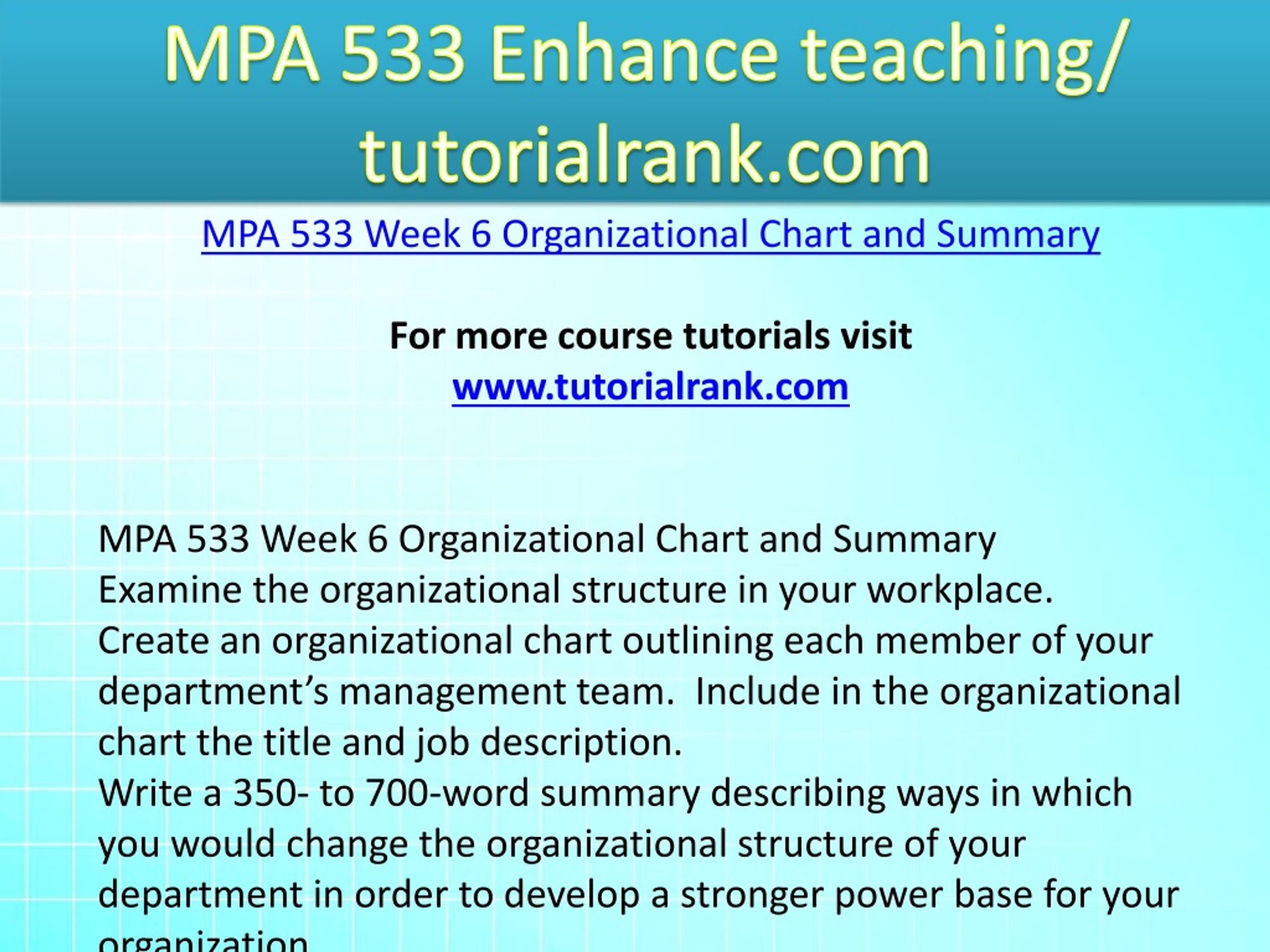 MPA 533 Enhance teaching/ tutorialrank.com MPA 533 Week 6 Organizational Chart and Summary For more course tutorials visit www.tutorialrank.com MPA 533 Week 6 Organizational Chart and Summary Examine the organizational structure in your workplace. Create an organizational chart outlining each member of your department’s management team. Include in the organizational chart the title and job description. Write a 350- to 700-word summary describing ways in which you would change the organizational structure of your department in order to develop a stronger power base for your organization.