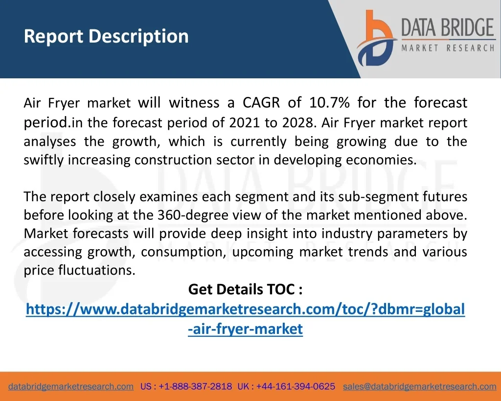 Report Description Air Fryer market will witness a CAGR of 10.7% for the forecast period.in the forecast period of 2021 to 2028. Air Fryer market report analyses the growth, which is currently being growing due to the swiftly increasing construction sector in developing economies. The report closely examines each segment and its sub-segment futures before looking at the 360-degree view of the market mentioned above. Market forecasts will provide deep insight into industry parameters by accessing growth, consumption, upcoming market trends and various price fluctuations. Get Details TOC : https://www.databridgemarketresearch.com/toc/?dbmr=global-air-fryer-market