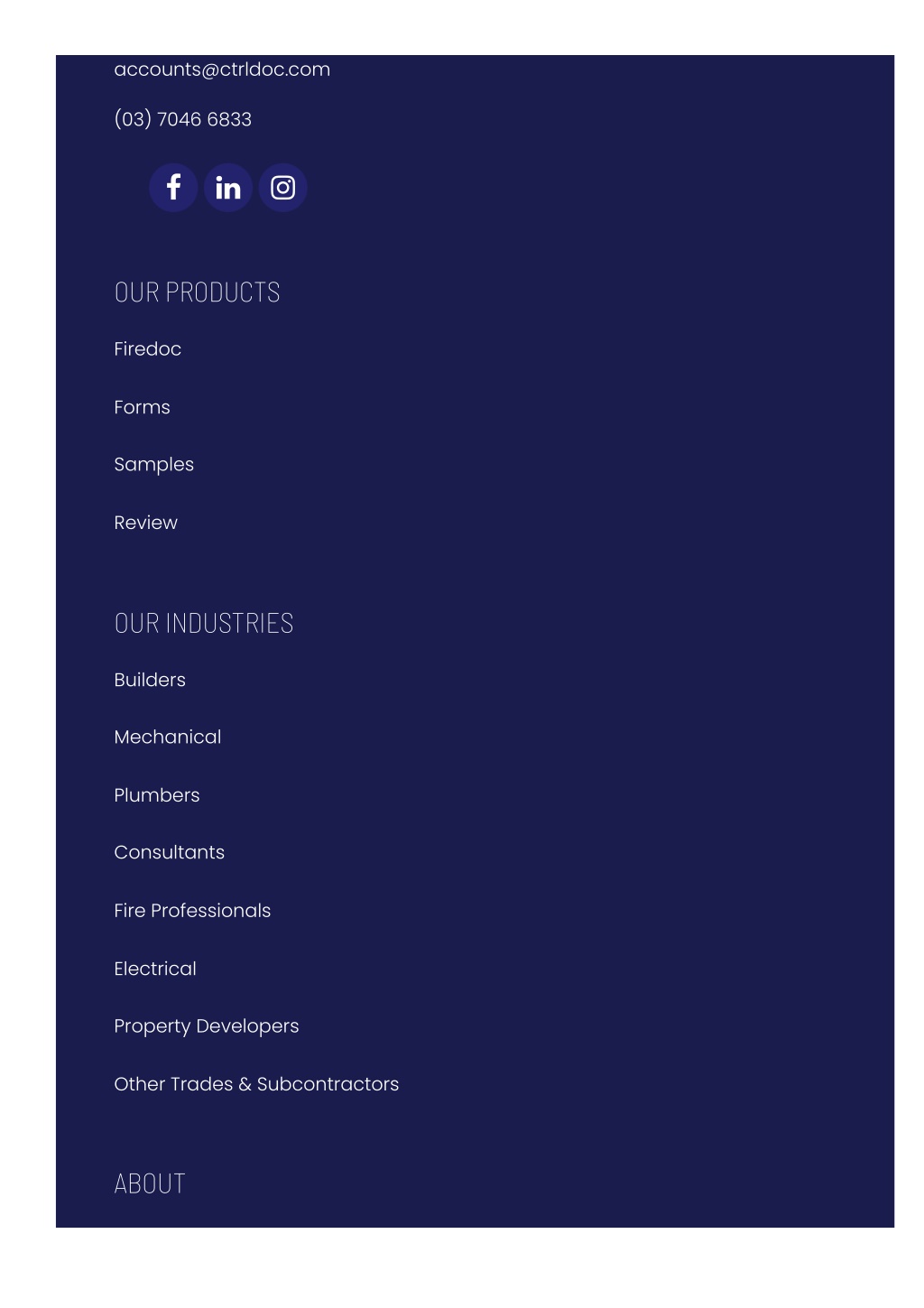 accounts@ctrldoc.com (03) 7046 6833 OUR PRODUCTS Firedoc Forms Samples Review OUR INDUSTRIES Builders Mechanical Plumbers Consultants Fire Professionals Electrical Property Developers Other Trades & Subcontractors ABOUT