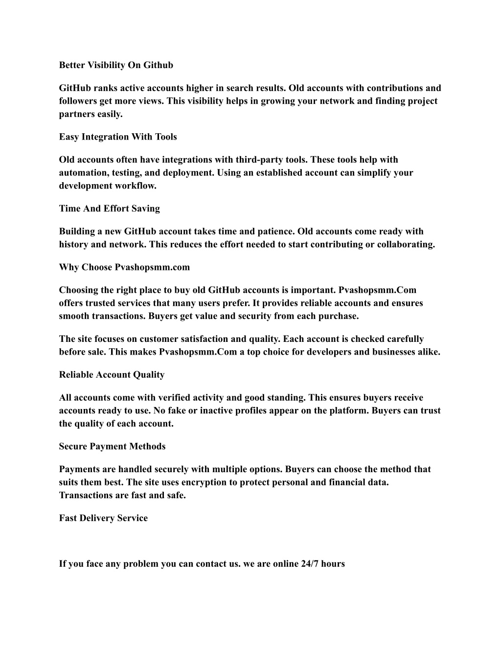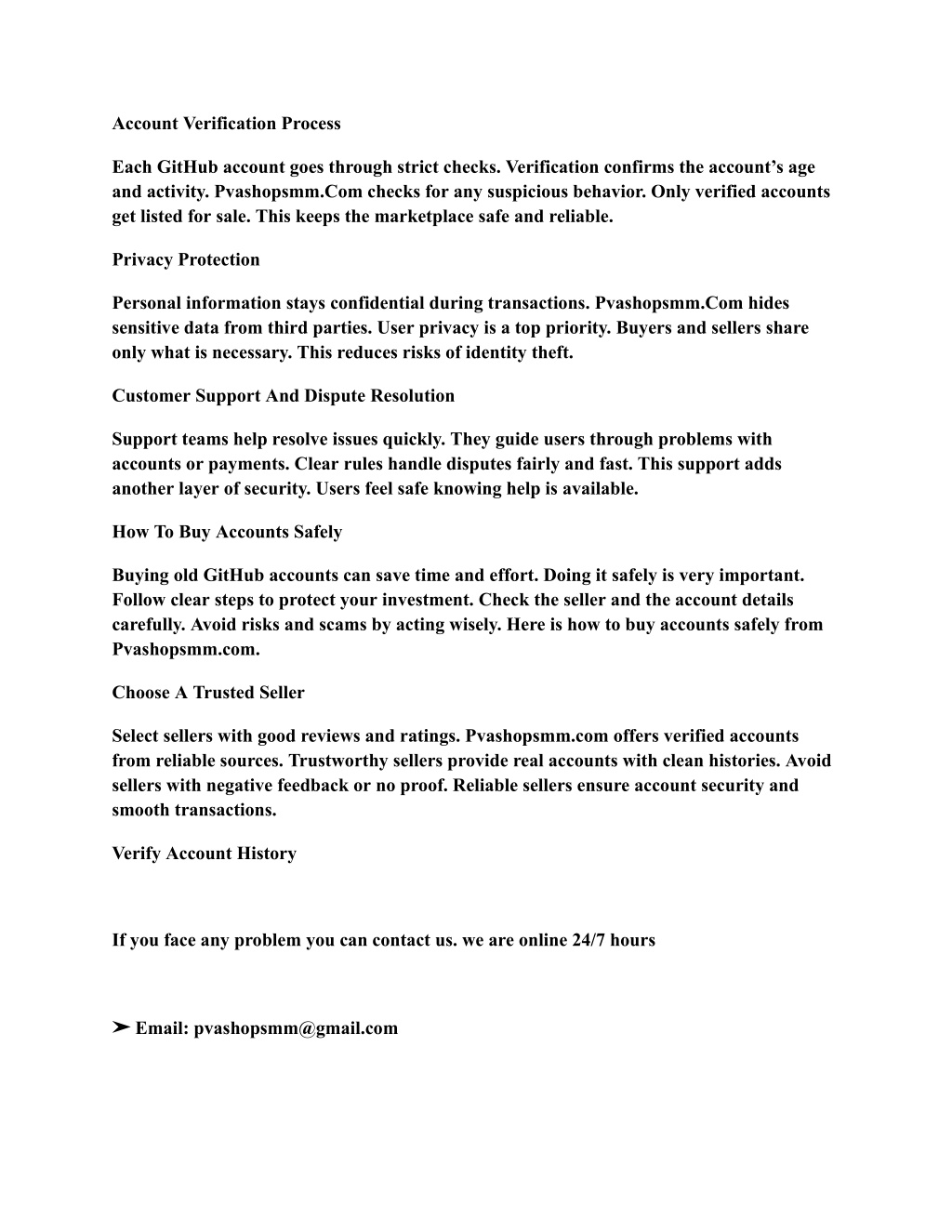 Account Verification Process Each GitHub account goes through strict checks. Verification confirms the account’s age and activity. Pvashopsmm.Com checks for any suspicious behavior. Only verified accounts get listed for sale. This keeps the marketplace safe and reliable. Privacy Protection Personal information stays confidential during transactions. Pvashopsmm.Com hides sensitive data from third parties. User privacy is a top priority. Buyers and sellers share only what is necessary. This reduces risks of identity theft. Customer Support And Dispute Resolution Support teams help resolve issues quickly. They guide users through problems with accounts or payments. Clear rules handle disputes fairly and fast. This support adds another layer of security. Users feel safe knowing help is available. How To Buy Accounts Safely Buying old GitHub accounts can save time and effort. Doing it safely is very important. Follow clear steps to protect your investment. Check the seller and the account details carefully. Avoid risks and scams by acting wisely. Here is how to buy accounts safely from Pvashopsmm.com. Choose A Trusted Seller Select sellers with good reviews and ratings. Pvashopsmm.com offers verified accounts from reliable sources. Trustworthy sellers provide real accounts with clean histories. Avoid sellers with negative feedback or no proof. Reliable sellers ensure account security and smooth transactions. Verify Account History If you face any problem you can contact us. we are online 24/7 hours ➤ Email: pvashopsmm@gmail.com