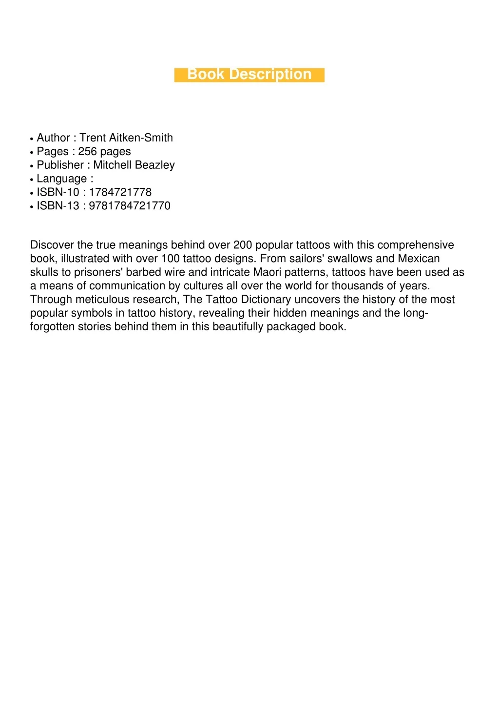 Book Description Author : Trent Aitken-Smith Pages : 256 pages Publisher : Mitchell Beazley Language : ISBN-10 : 1784721778 ISBN-13 : 9781784721770 G G G G G G Discover the true meanings behind over 200 popular tattoos with this comprehensive book, illustrated with over 100 tattoo designs. From sailors' swallows and Mexican skulls to prisoners' barbed wire and intricate Maori patterns, tattoos have been used as a means of communication by cultures all over the world for thousands of years. Through meticulous research, The Tattoo Dictionary uncovers the history of the most popular symbols in tattoo history, revealing their hidden meanings and the long- forgotten stories behind them in this beautifully packaged book.
