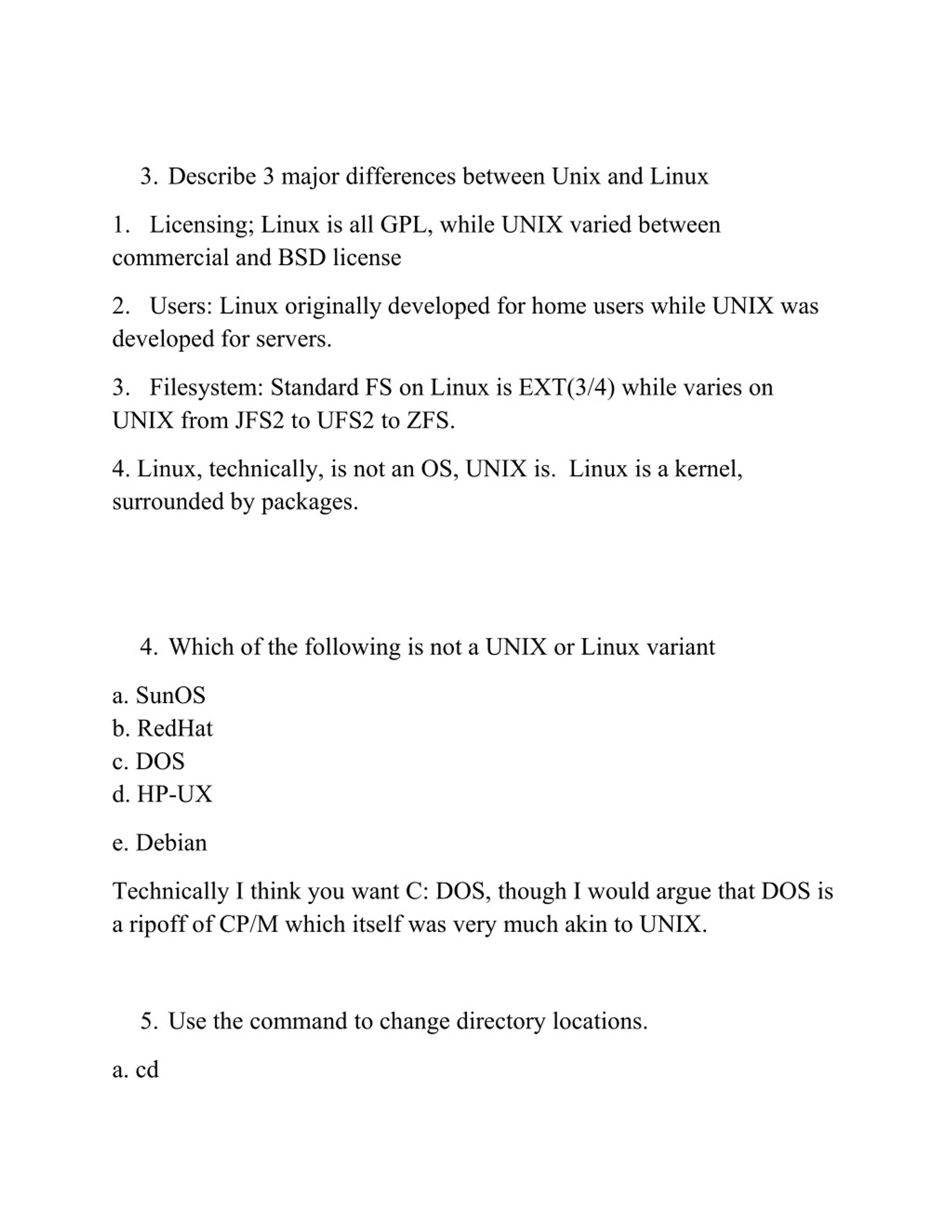 3. Describe 3 major differences between Unix and Linux 1. Licensing; Linux is all GPL, while UNIX varied between commercial and BSD license 2. Users: Linux originally developed for home users while UNIX was developed for servers. 3. Filesystem: Standard FS on Linux is EXT(3/4) while varies on UNIX from JFS2 to UFS2 to ZFS. 4. Linux, technically, is not an OS, UNIX is. Linux is a kernel, surrounded by packages. 4. Which of the following is not a UNIX or Linux variant a. SunOS b. RedHat c. DOS d. HP-UX e. Debian Technically I think you want C: DOS, though I would argue that DOS is a ripoff of CP/M which itself was very much akin to UNIX. 5. Use the command to change directory locations. a. cd