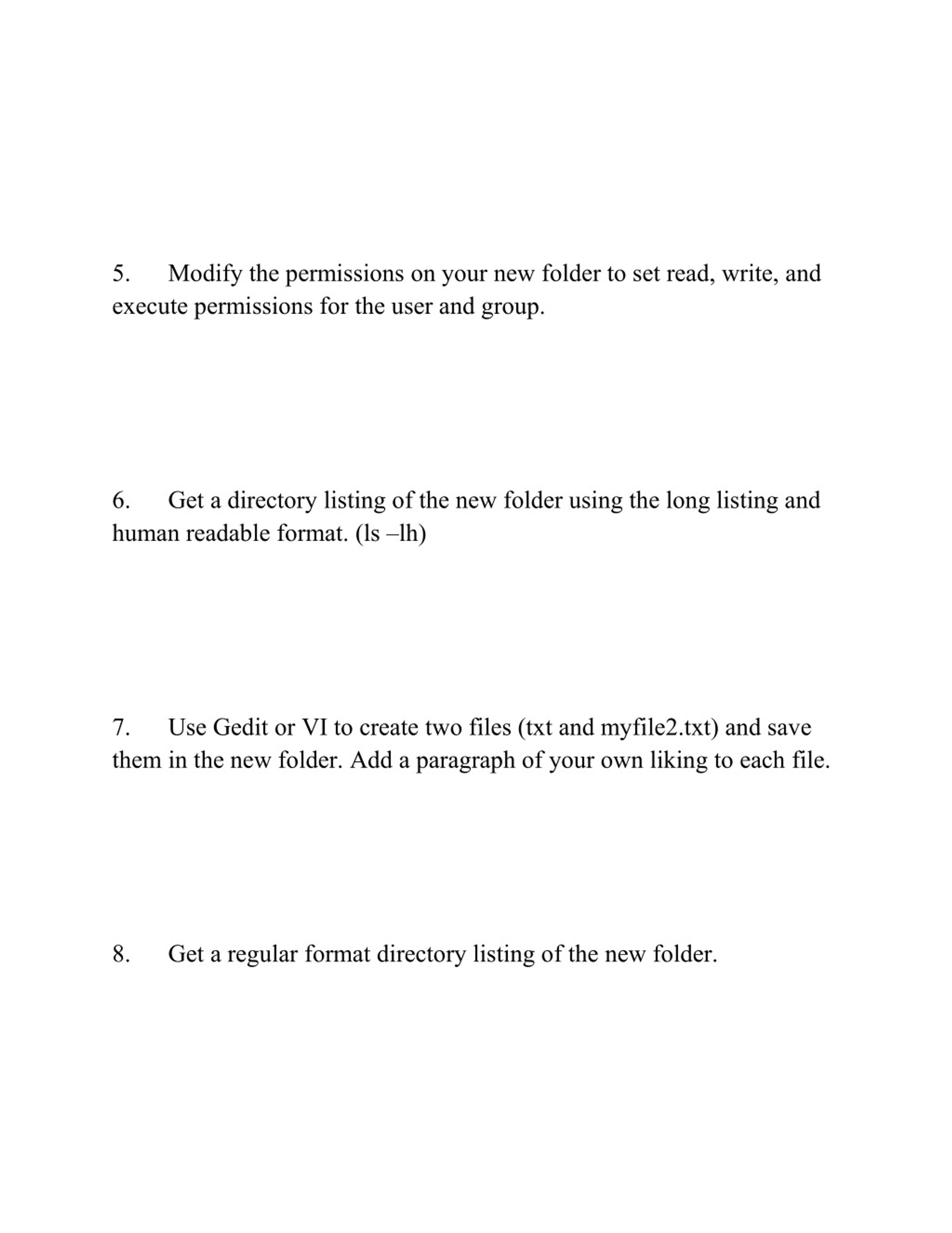 5. execute permissions for the user and group. Modify the permissions on your new folder to set read, write, and 6. human readable format. (ls –lh) Get a directory listing of the new folder using the long listing and 7. them in the new folder. Add a paragraph of your own liking to each file. Use Gedit or VI to create two files (txt and myfile2.txt) and save 8. Get a regular format directory listing of the new folder.