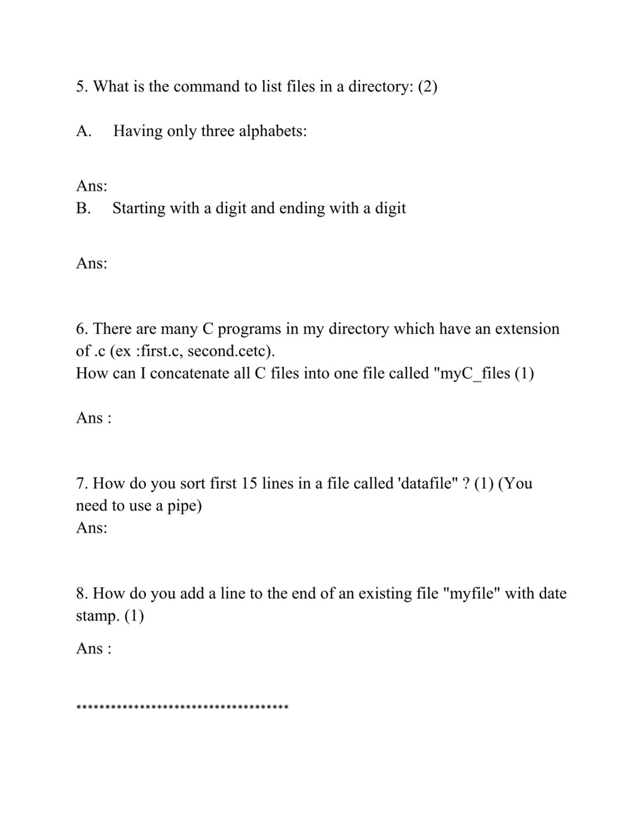 5. What is the command to list files in a directory: (2) A. Having only three alphabets: Ans: B. Starting with a digit and ending with a digit Ans: 6. There are many C programs in my directory which have an extension of .c (ex :first.c, second.cetc). How can I concatenate all C files into one file called "myC_files (1) Ans : 7. How do you sort first 15 lines in a file called 'datafile" ? (1) (You need to use a pipe) Ans: 8. How do you add a line to the end of an existing file "myfile" with date stamp. (1) Ans : *************************************