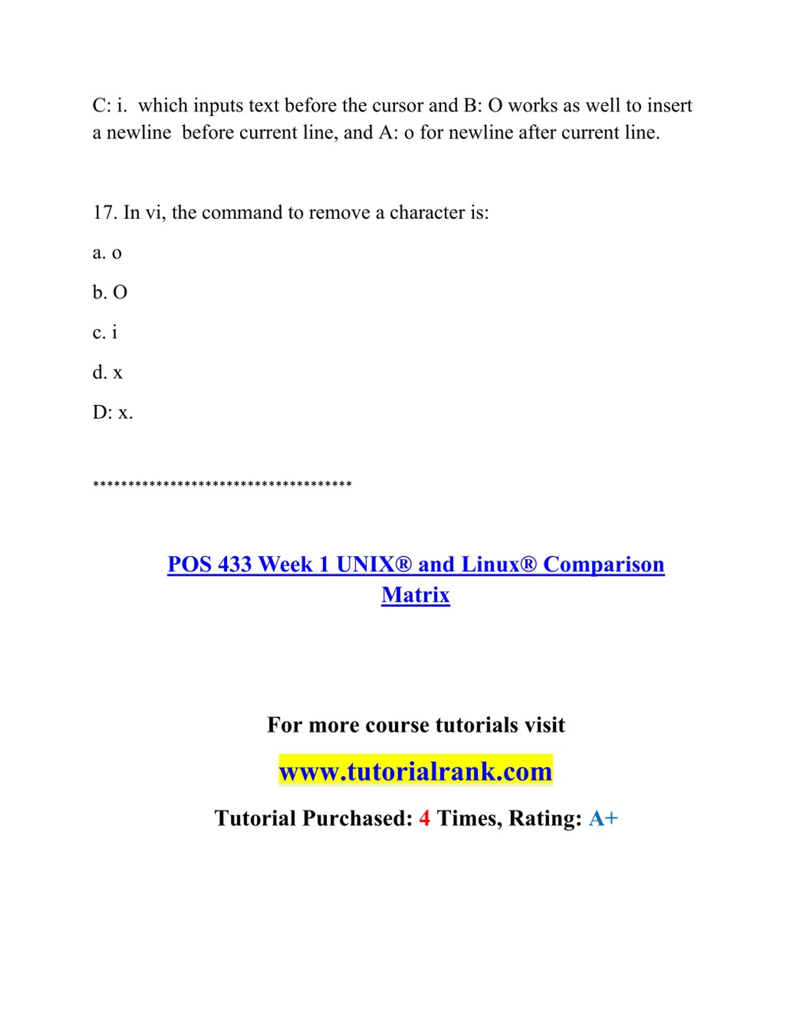 C: i. which inputs text before the cursor and B: O works as well to insert a newline before current line, and A: o for newline after current line. 17. In vi, the command to remove a character is: a. o b. O c. i d. x D: x. ************************************* POS 433 Week 1 UNIX® and Linux® Comparison Matrix For more course tutorials visit www.tutorialrank.com Tutorial Purchased: 4 Times, Rating: A+