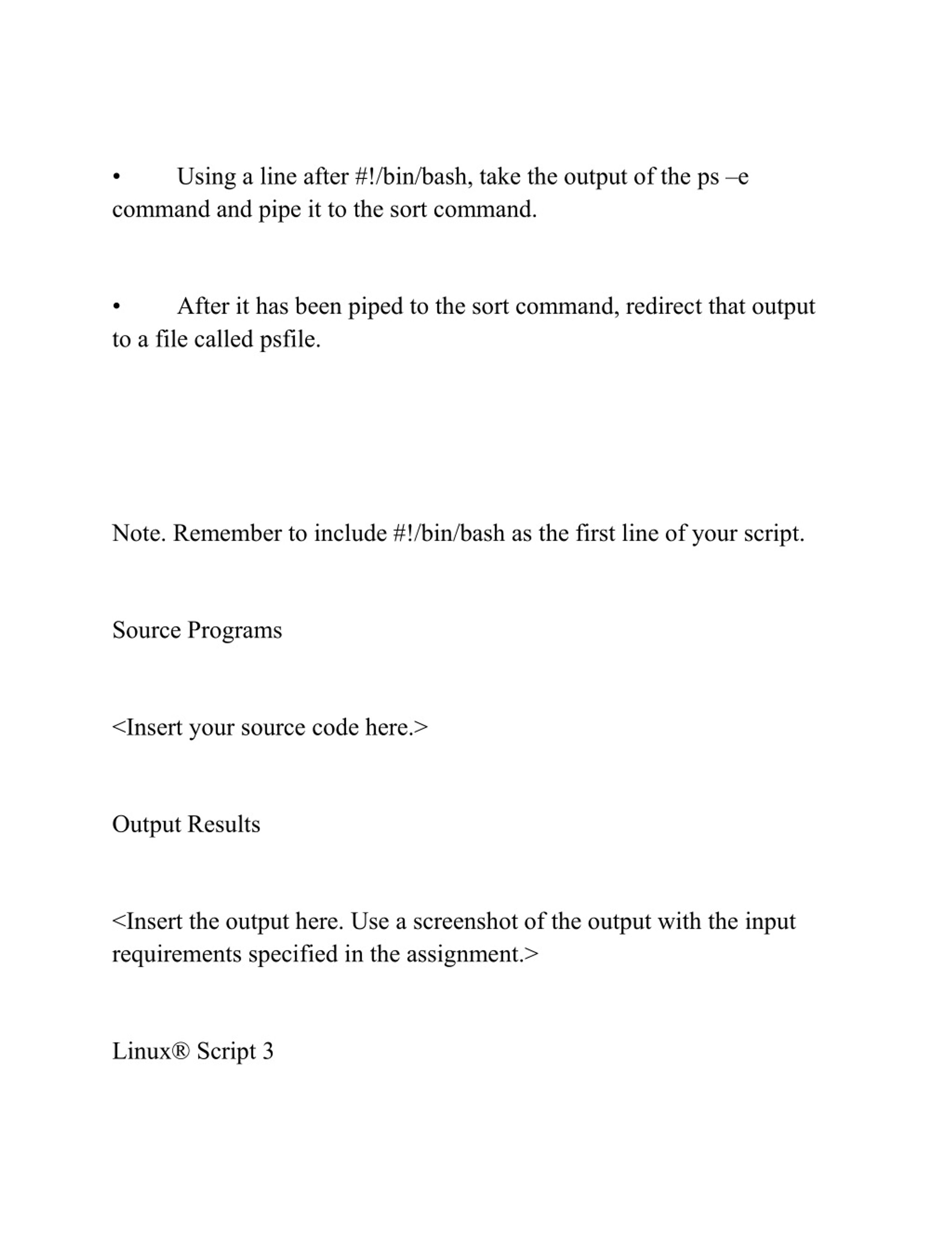 • command and pipe it to the sort command. Using a line after #!/bin/bash, take the output of the ps –e • to a file called psfile. After it has been piped to the sort command, redirect that output Note. Remember to include #!/bin/bash as the first line of your script. Source Programs <Insert your source code here.> Output Results <Insert the output here. Use a screenshot of the output with the input requirements specified in the assignment.> Linux® Script 3