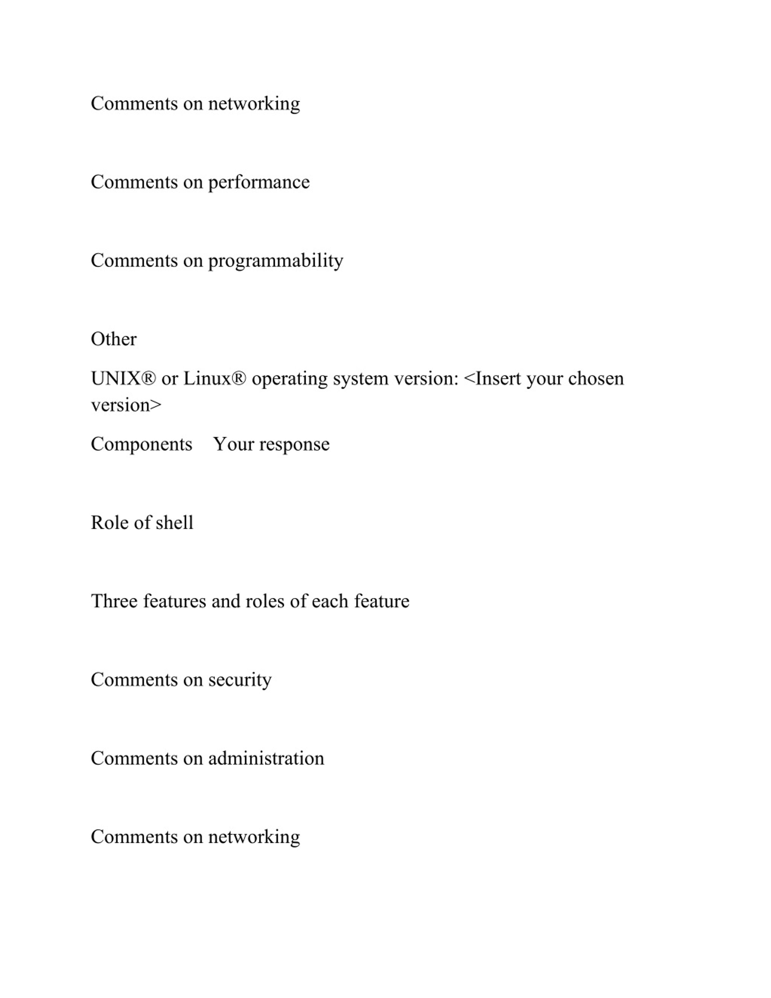 Comments on networking Comments on performance Comments on programmability Other UNIX® or Linux® operating system version: <Insert your chosen version> Components Your response Role of shell Three features and roles of each feature Comments on security Comments on administration Comments on networking