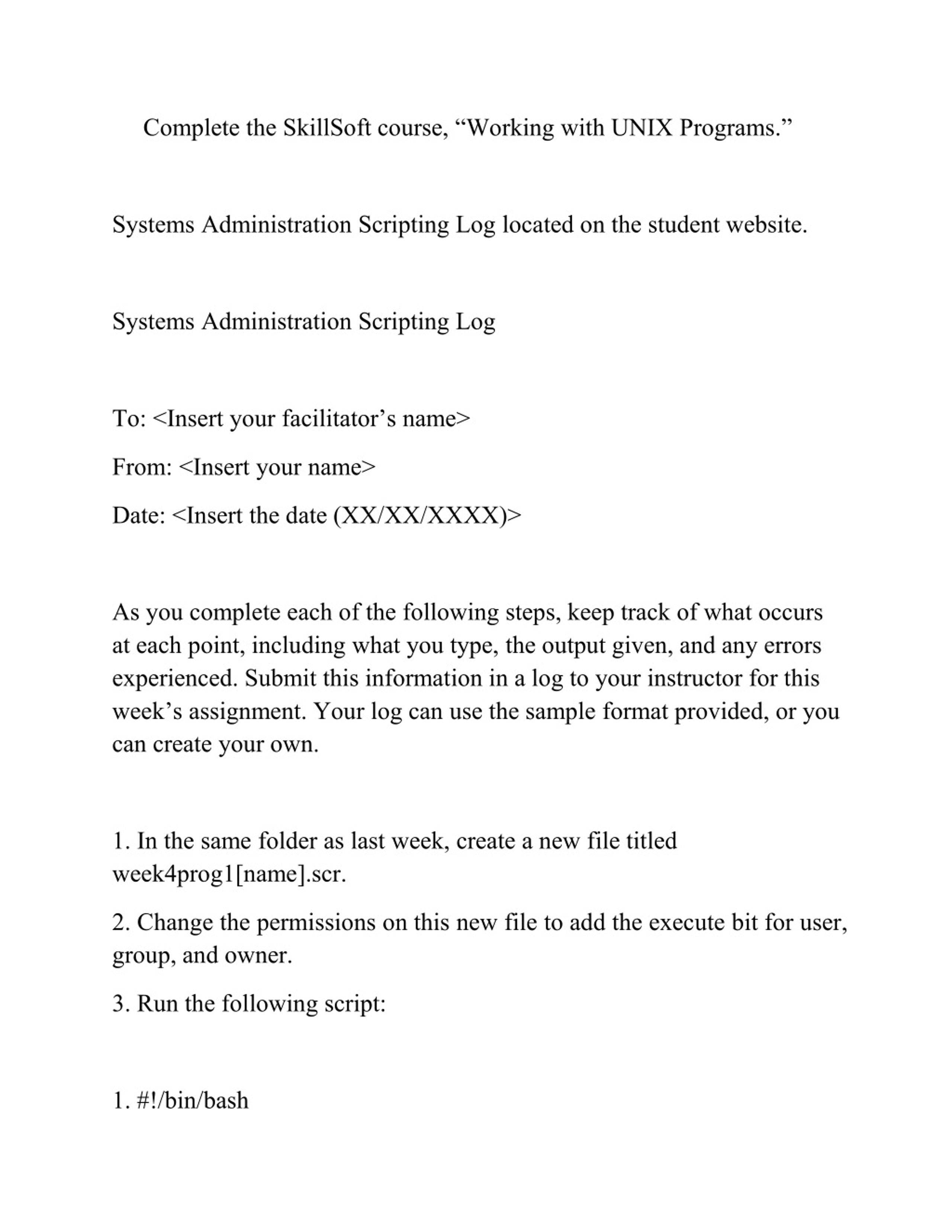Complete the SkillSoft course, “Working with UNIX Programs.” Systems Administration Scripting Log located on the student website. Systems Administration Scripting Log To: <Insert your facilitator’s name> From: <Insert your name> Date: <Insert the date (XX/XX/XXXX)> As you complete each of the following steps, keep track of what occurs at each point, including what you type, the output given, and any errors experienced. Submit this information in a log to your instructor for this week’s assignment. Your log can use the sample format provided, or you can create your own. 1. In the same folder as last week, create a new file titled week4prog1[name].scr. 2. Change the permissions on this new file to add the execute bit for user, group, and owner. 3. Run the following script: 1. #!/bin/bash