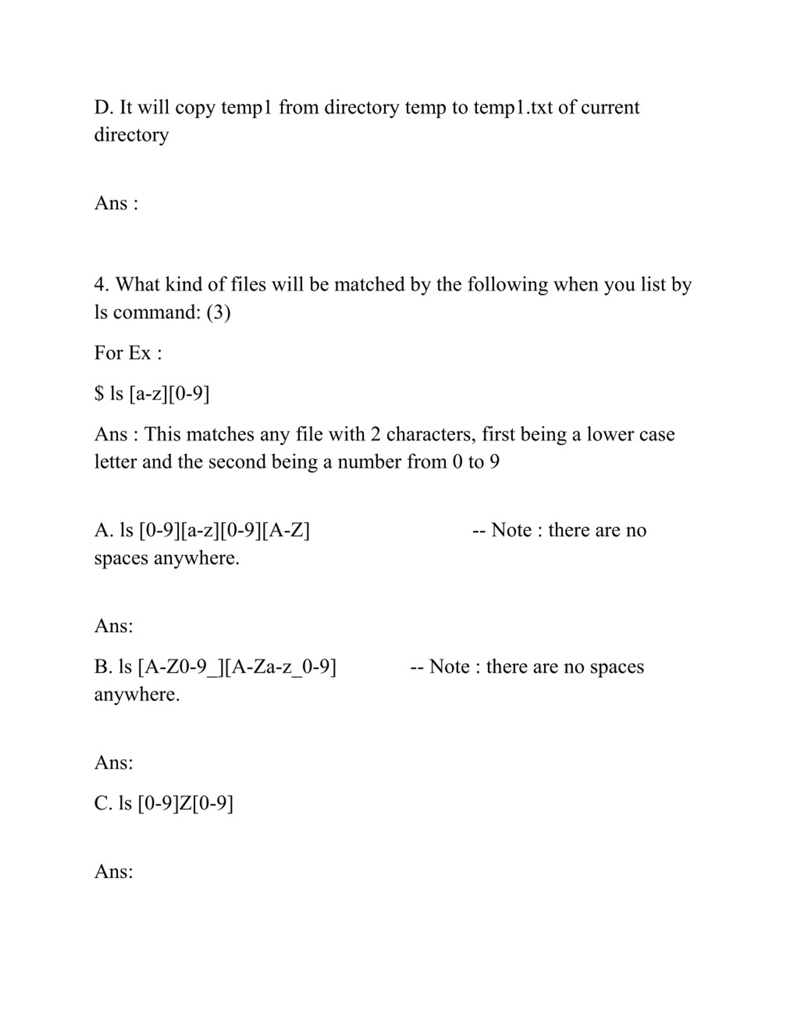 D. It will copy temp1 from directory temp to temp1.txt of current directory Ans : 4. What kind of files will be matched by the following when you list by ls command: (3) For Ex : $ ls [a-z][0-9] Ans : This matches any file with 2 characters, first being a lower case letter and the second being a number from 0 to 9 A. ls [0-9][a-z][0-9][A-Z] spaces anywhere. -- Note : there are no Ans: B. ls [A-Z0-9_][A-Za-z_0-9] anywhere. -- Note : there are no spaces Ans: C. ls [0-9]Z[0-9] Ans: