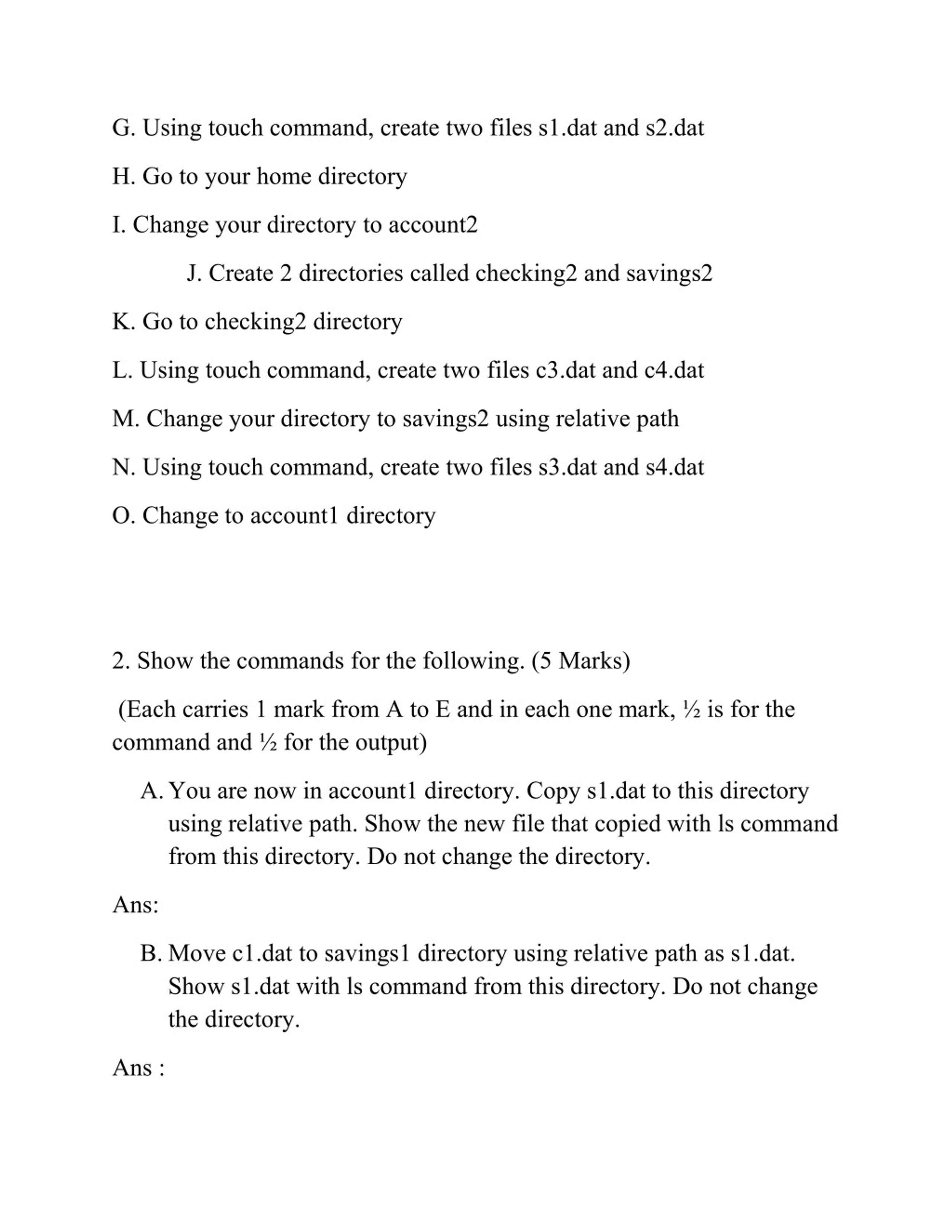 G. Using touch command, create two files s1.dat and s2.dat H. Go to your home directory I. Change your directory to account2 J. Create 2 directories called checking2 and savings2 K. Go to checking2 directory L. Using touch command, create two files c3.dat and c4.dat M. Change your directory to savings2 using relative path N. Using touch command, create two files s3.dat and s4.dat O. Change to account1 directory 2. Show the commands for the following. (5 Marks) (Each carries 1 mark from A to E and in each one mark, ½ is for the command and ½ for the output) A.You are now in account1 directory. Copy s1.dat to this directory using relative path. Show the new file that copied with ls command from this directory. Do not change the directory. Ans: B. Move c1.dat to savings1 directory using relative path as s1.dat. Show s1.dat with ls command from this directory. Do not change the directory. Ans :