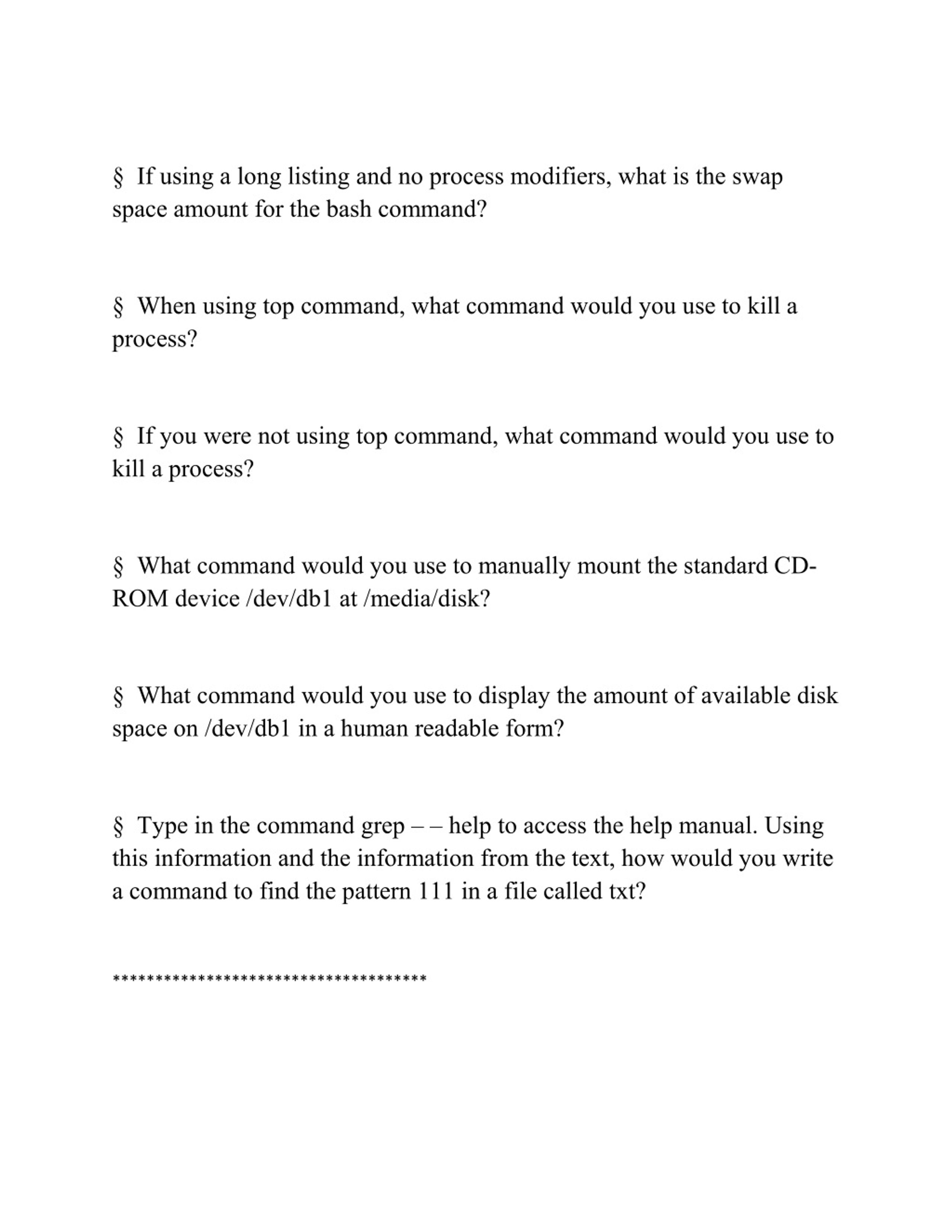 § If using a long listing and no process modifiers, what is the swap space amount for the bash command? § When using top command, what command would you use to kill a process? § If you were not using top command, what command would you use to kill a process? § What command would you use to manually mount the standard CD- ROM device /dev/db1 at /media/disk? § What command would you use to display the amount of available disk space on /dev/db1 in a human readable form? § Type in the command grep – – help to access the help manual. Using this information and the information from the text, how would you write a command to find the pattern 111 in a file called txt? *************************************