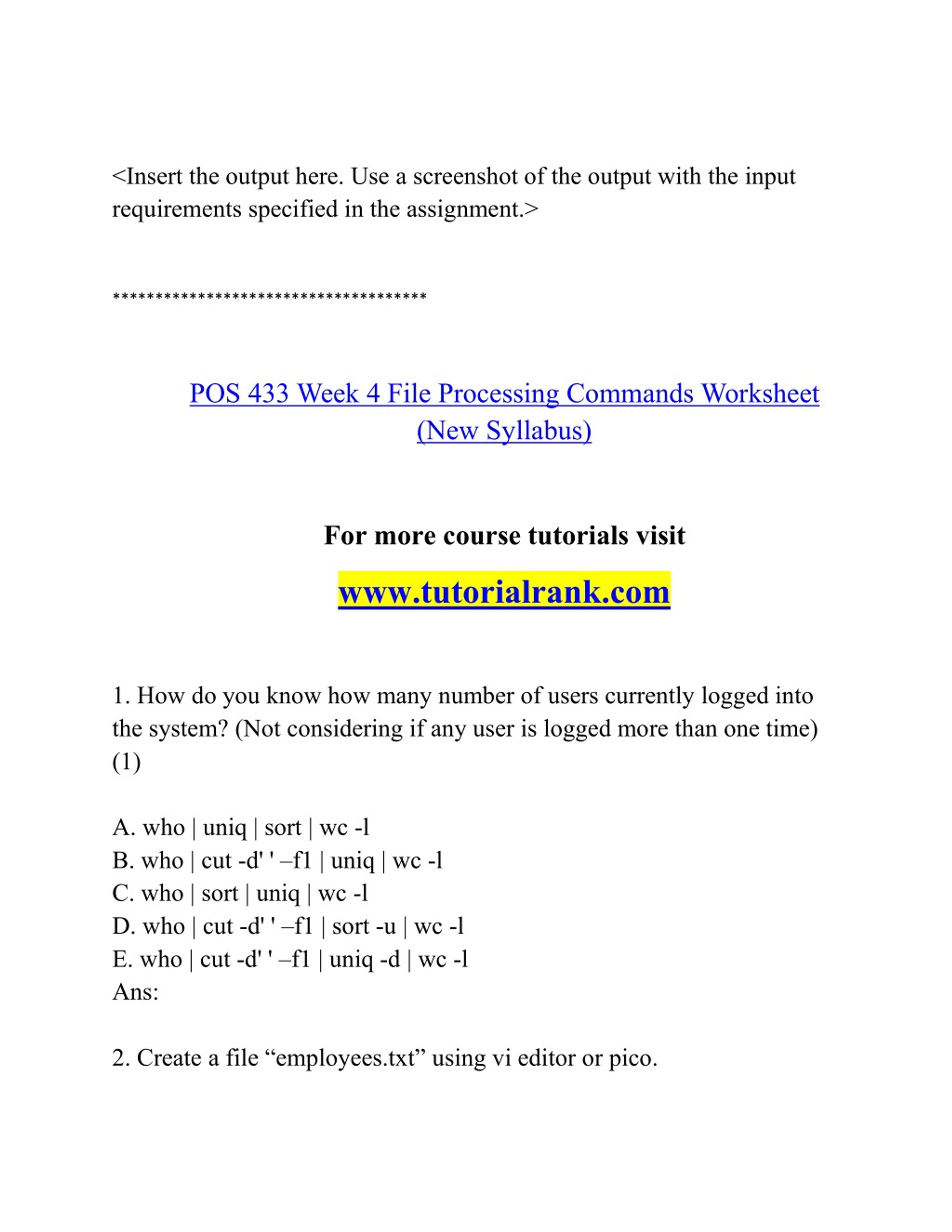 <Insert the output here. Use a screenshot of the output with the input requirements specified in the assignment.> ************************************* POS 433 Week 4 File Processing Commands Worksheet (New Syllabus) For more course tutorials visit www.tutorialrank.com 1. How do you know how many number of users currently logged into the system? (Not considering if any user is logged more than one time) (1) A. who | uniq | sort | wc -l B. who | cut -d' ' –f1 | uniq | wc -l C. who | sort | uniq | wc -l D. who | cut -d' ' –f1 | sort -u | wc -l E. who | cut -d' ' –f1 | uniq -d | wc -l Ans: 2. Create a file “employees.txt” using vi editor or pico.