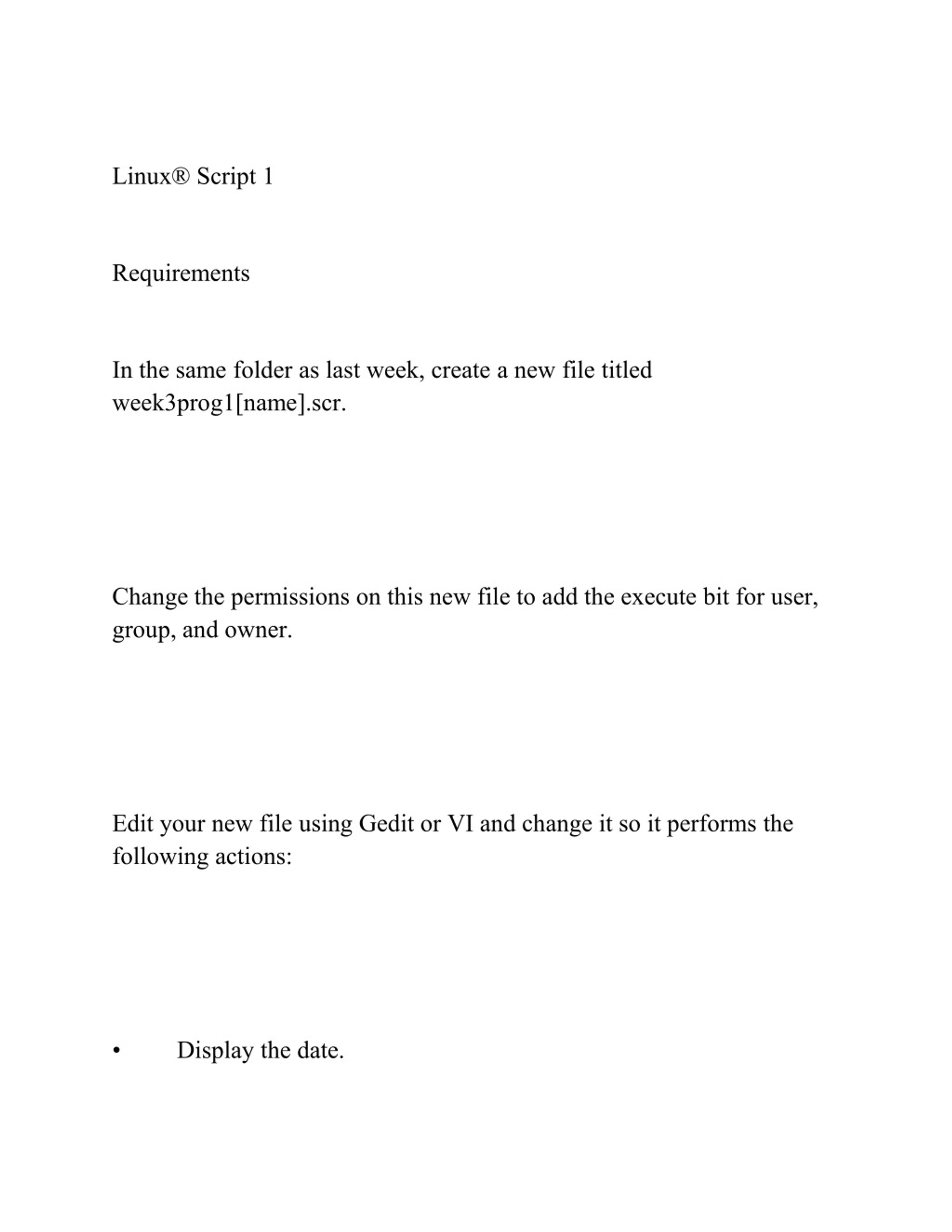 Linux® Script 1 Requirements In the same folder as last week, create a new file titled week3prog1[name].scr. Change the permissions on this new file to add the execute bit for user, group, and owner. Edit your new file using Gedit or VI and change it so it performs the following actions: • Display the date.