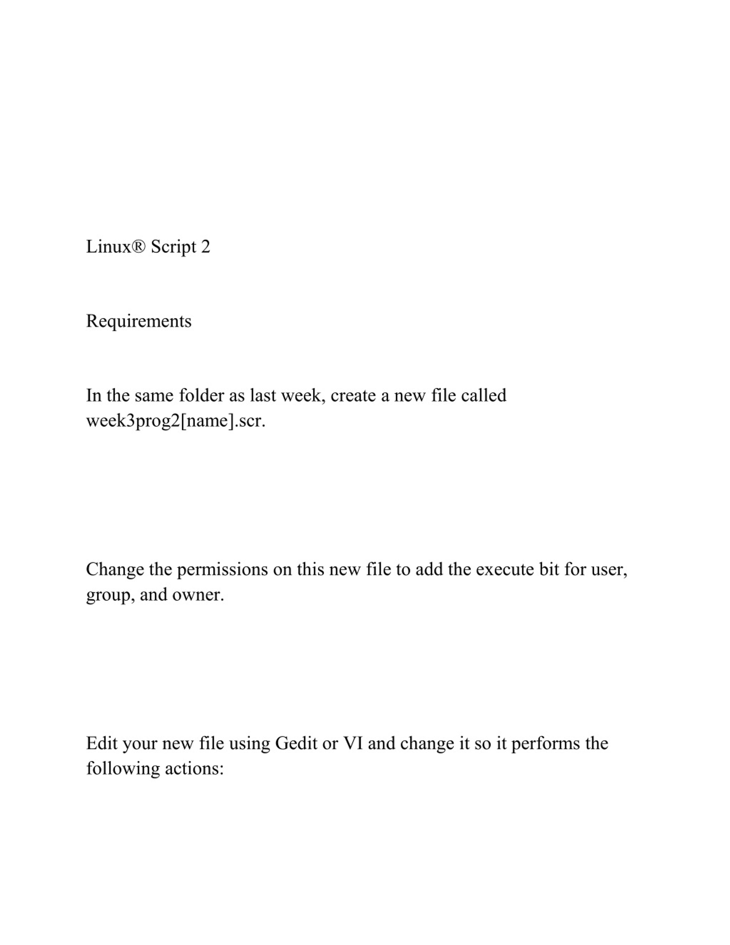 Linux® Script 2 Requirements In the same folder as last week, create a new file called week3prog2[name].scr. Change the permissions on this new file to add the execute bit for user, group, and owner. Edit your new file using Gedit or VI and change it so it performs the following actions: