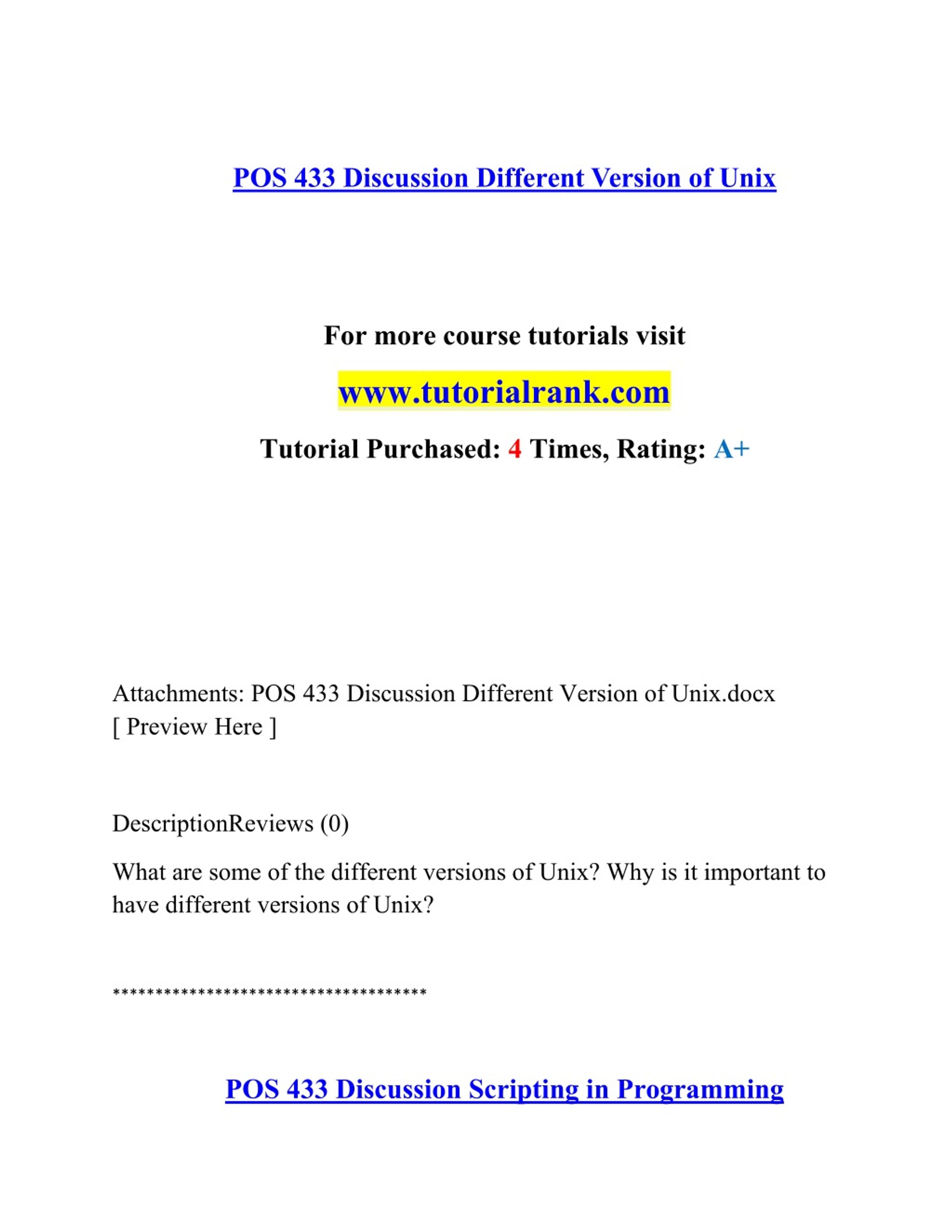 POS 433 Discussion Different Version of Unix For more course tutorials visit www.tutorialrank.com Tutorial Purchased: 4 Times, Rating: A+ Attachments: POS 433 Discussion Different Version of Unix.docx [ Preview Here ] DescriptionReviews (0) What are some of the different versions of Unix? Why is it important to have different versions of Unix? ************************************* POS 433 Discussion Scripting in Programming