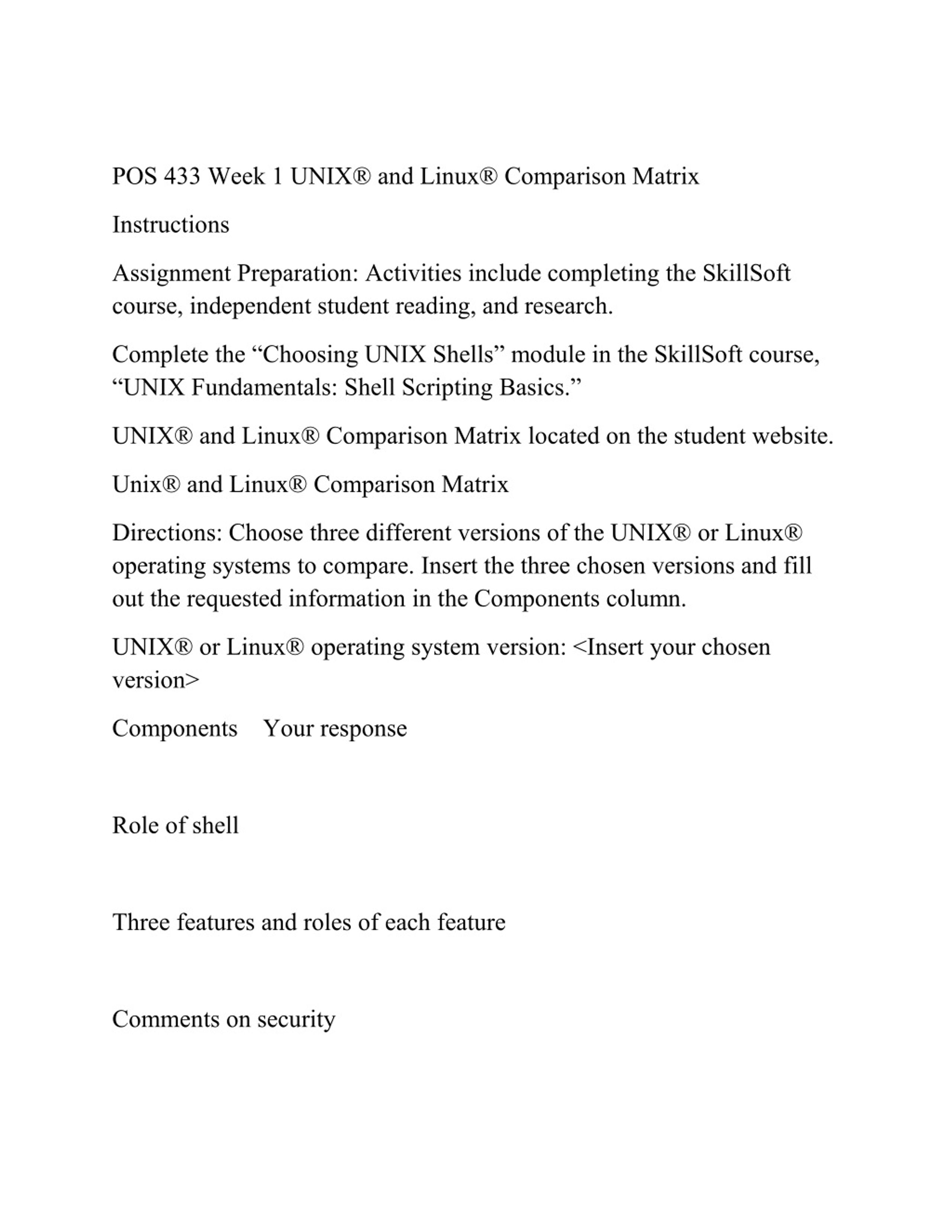 POS 433 Week 1 UNIX® and Linux® Comparison Matrix Instructions Assignment Preparation: Activities include completing the SkillSoft course, independent student reading, and research. Complete the “Choosing UNIX Shells” module in the SkillSoft course, “UNIX Fundamentals: Shell Scripting Basics.” UNIX® and Linux® Comparison Matrix located on the student website. Unix® and Linux® Comparison Matrix Directions: Choose three different versions of the UNIX® or Linux® operating systems to compare. Insert the three chosen versions and fill out the requested information in the Components column. UNIX® or Linux® operating system version: <Insert your chosen version> Components Your response Role of shell Three features and roles of each feature Comments on security