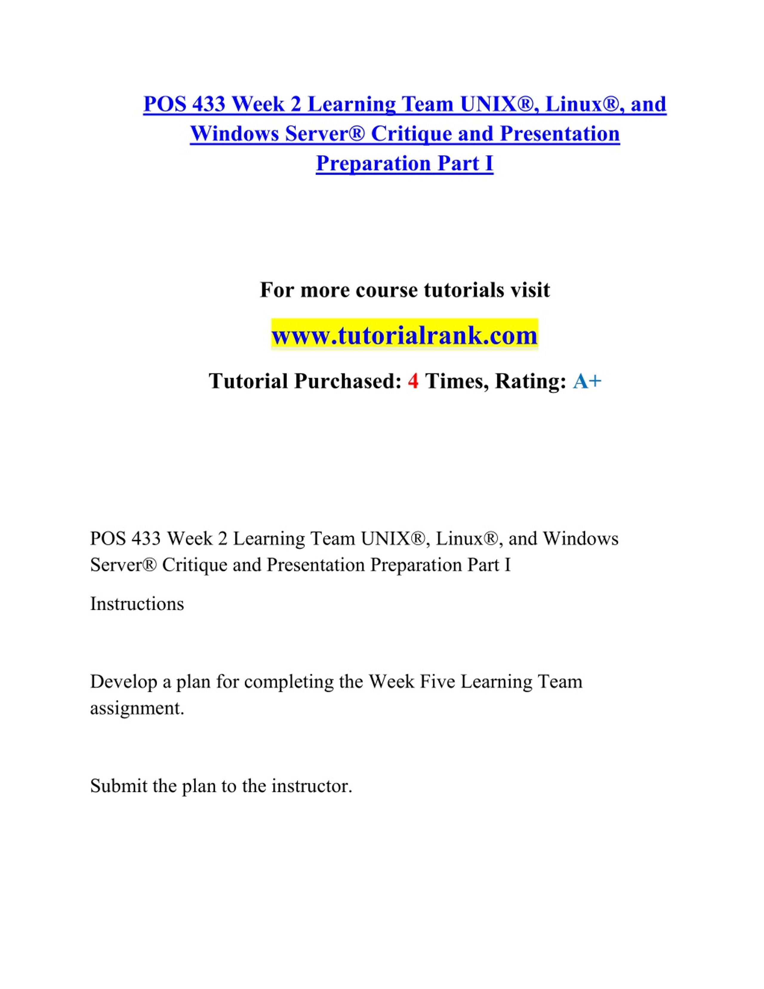 POS 433 Week 2 Learning Team UNIX®, Linux®, and Windows Server® Critique and Presentation Preparation Part I For more course tutorials visit www.tutorialrank.com Tutorial Purchased: 4 Times, Rating: A+ POS 433 Week 2 Learning Team UNIX®, Linux®, and Windows Server® Critique and Presentation Preparation Part I Instructions Develop a plan for completing the Week Five Learning Team assignment. Submit the plan to the instructor.