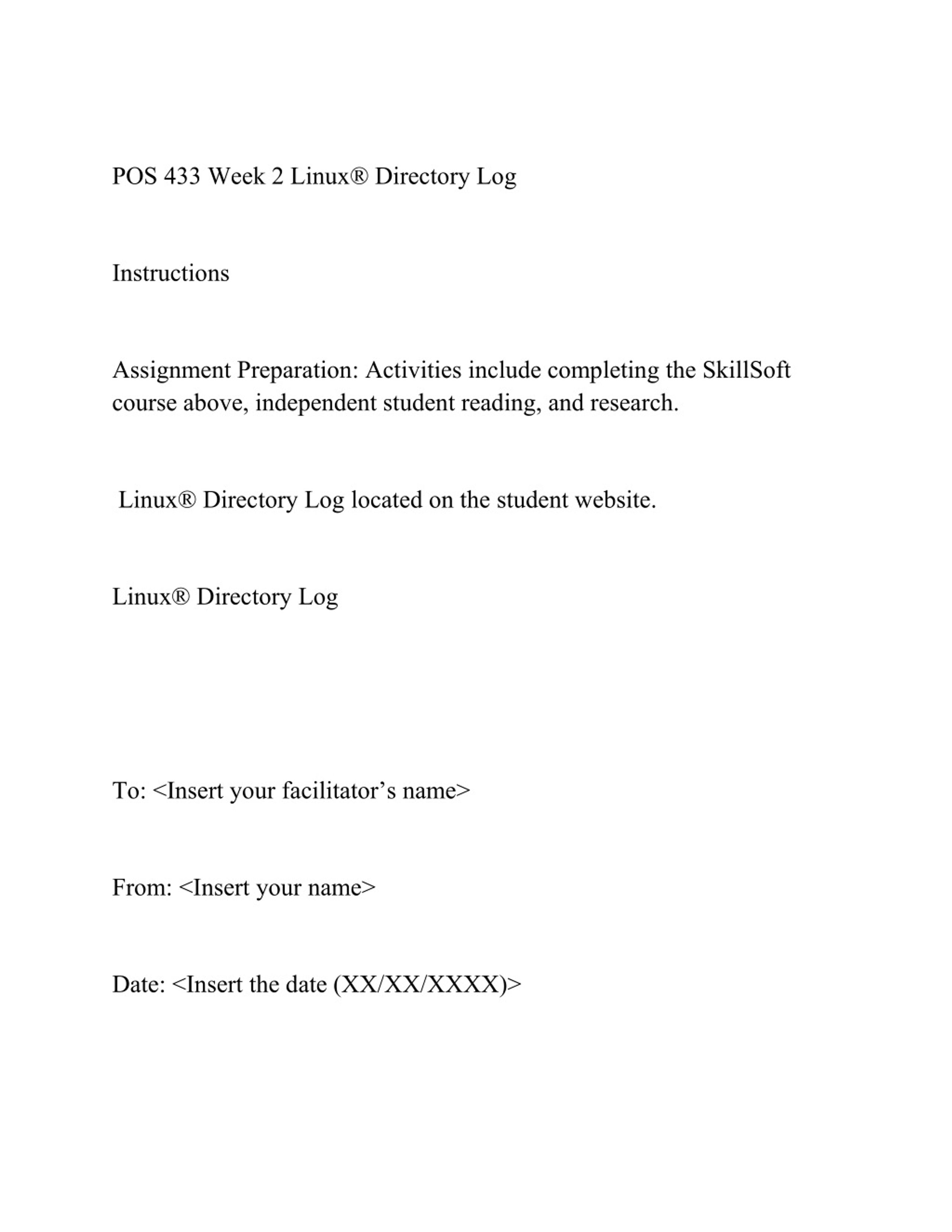 POS 433 Week 2 Linux® Directory Log Instructions Assignment Preparation: Activities include completing the SkillSoft course above, independent student reading, and research. Linux® Directory Log located on the student website. Linux® Directory Log To: <Insert your facilitator’s name> From: <Insert your name> Date: <Insert the date (XX/XX/XXXX)>