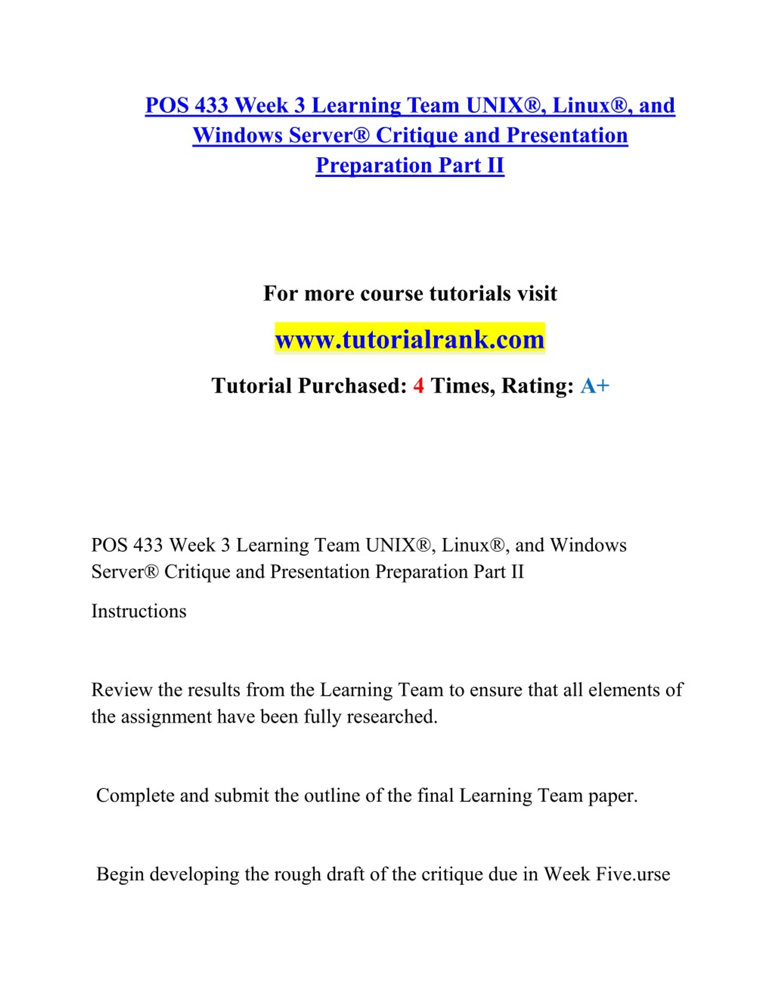 POS 433 Week 3 Learning Team UNIX®, Linux®, and Windows Server® Critique and Presentation Preparation Part II For more course tutorials visit www.tutorialrank.com Tutorial Purchased: 4 Times, Rating: A+ POS 433 Week 3 Learning Team UNIX®, Linux®, and Windows Server® Critique and Presentation Preparation Part II Instructions Review the results from the Learning Team to ensure that all elements of the assignment have been fully researched. Complete and submit the outline of the final Learning Team paper. Begin developing the rough draft of the critique due in Week Five.urse