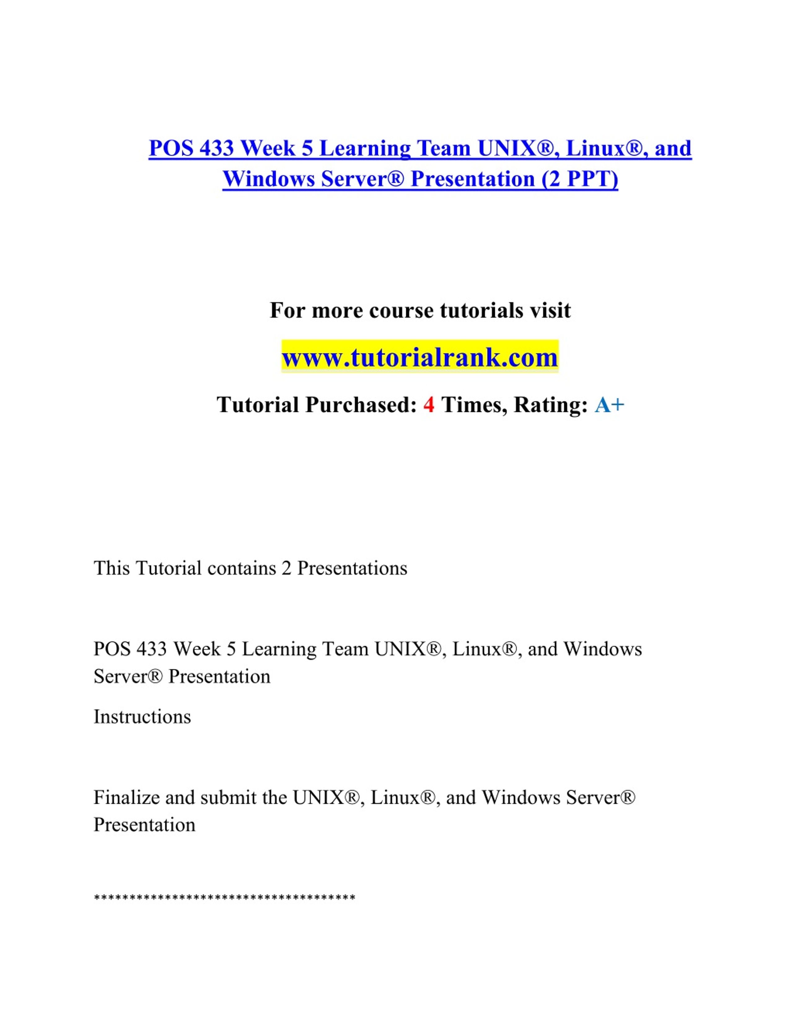 POS 433 Week 5 Learning Team UNIX®, Linux®, and Windows Server® Presentation (2 PPT) For more course tutorials visit www.tutorialrank.com Tutorial Purchased: 4 Times, Rating: A+ This Tutorial contains 2 Presentations POS 433 Week 5 Learning Team UNIX®, Linux®, and Windows Server® Presentation Instructions Finalize and submit the UNIX®, Linux®, and Windows Server® Presentation *************************************