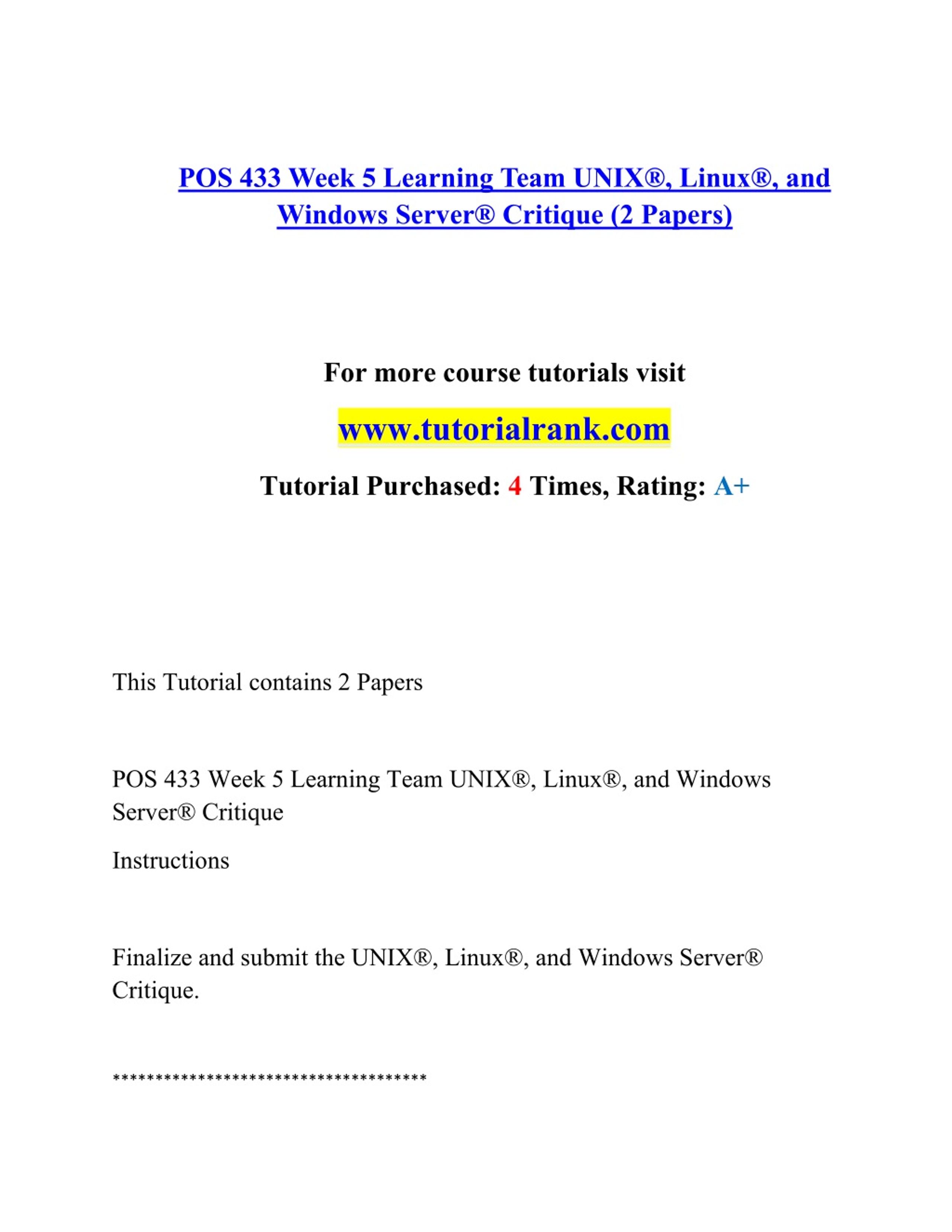 POS 433 Week 5 Learning Team UNIX®, Linux®, and Windows Server® Critique (2 Papers) For more course tutorials visit www.tutorialrank.com Tutorial Purchased: 4 Times, Rating: A+ This Tutorial contains 2 Papers POS 433 Week 5 Learning Team UNIX®, Linux®, and Windows Server® Critique Instructions Finalize and submit the UNIX®, Linux®, and Windows Server® Critique. *************************************