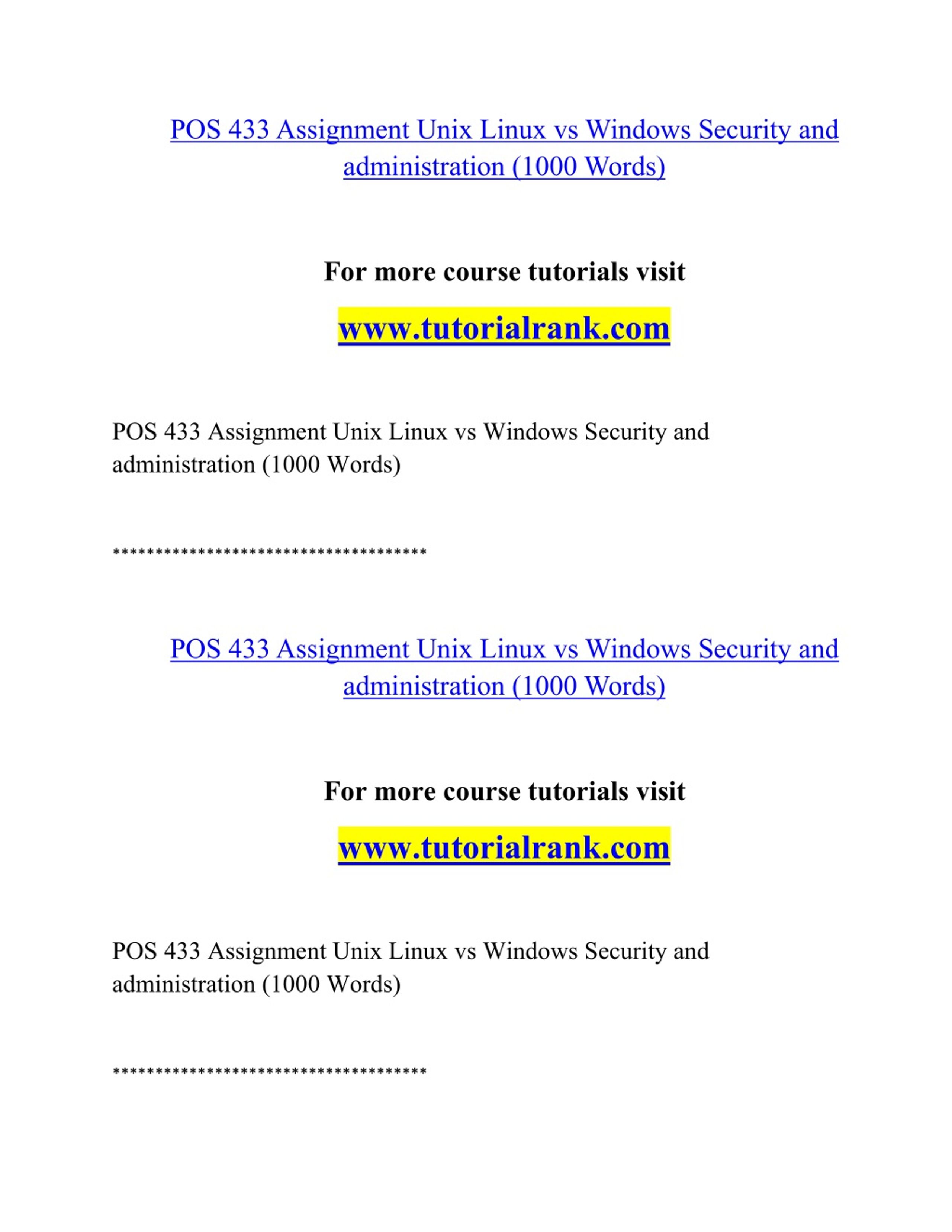 POS 433Assignment Unix Linux vs Windows Security and administration (1000 Words) For more course tutorials visit www.tutorialrank.com POS 433 Assignment Unix Linux vs Windows Security and administration (1000 Words) ************************************* POS 433Assignment Unix Linux vs Windows Security and administration (1000 Words) For more course tutorials visit www.tutorialrank.com POS 433 Assignment Unix Linux vs Windows Security and administration (1000 Words) *************************************