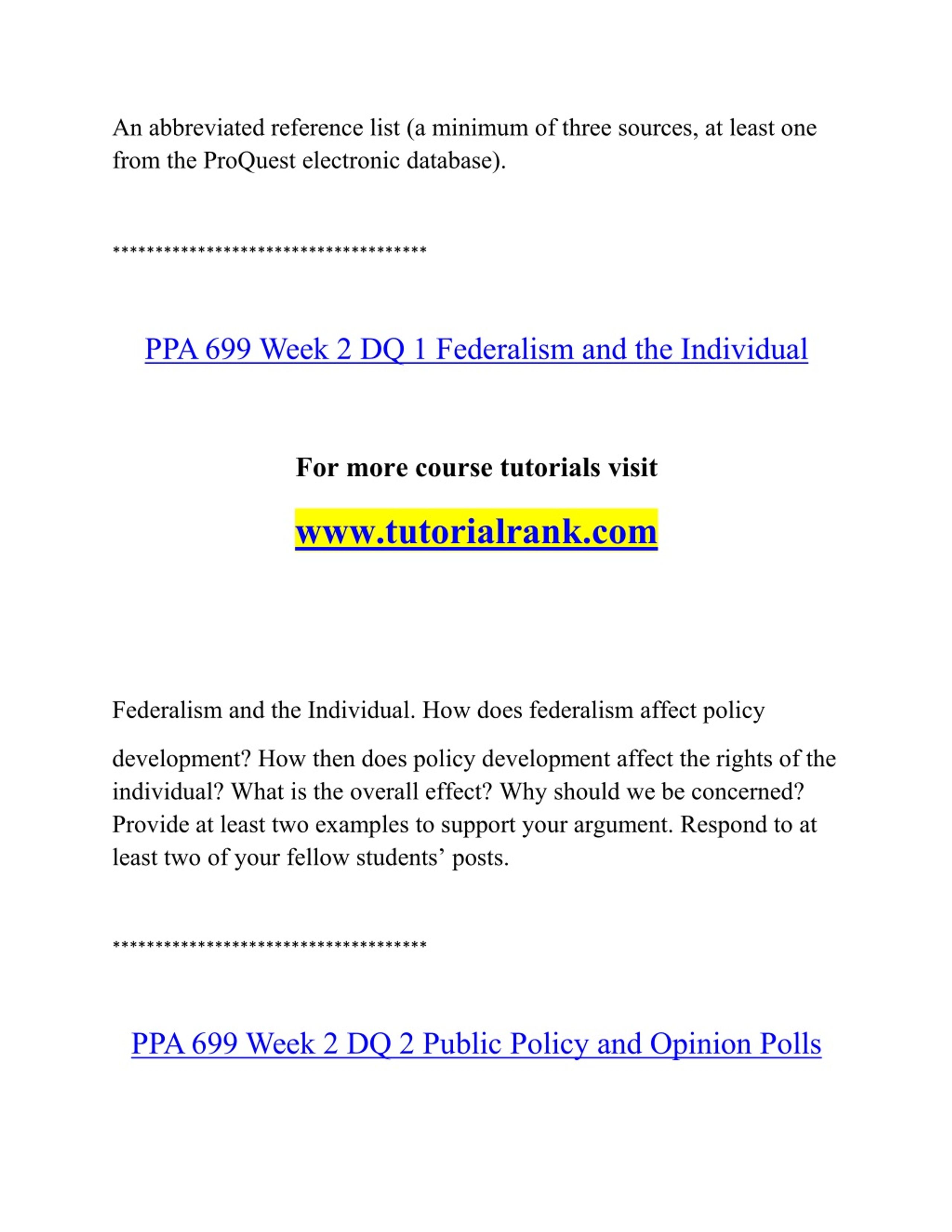 An abbreviated reference list (a minimum of three sources, at least one from the ProQuest electronic database). ************************************* PPA699 Week 2 DQ 1 Federalism and the Individual For more course tutorials visit www.tutorialrank.com Federalism and the Individual. How does federalism affect policy development? How then does policy development affect the rights of the individual? What is the overall effect? Why should we be concerned? Provide at least two examples to support your argument. Respond to at least two of your fellow students’ posts. ************************************* PPA699 Week 2 DQ 2 Public Policy and Opinion Polls