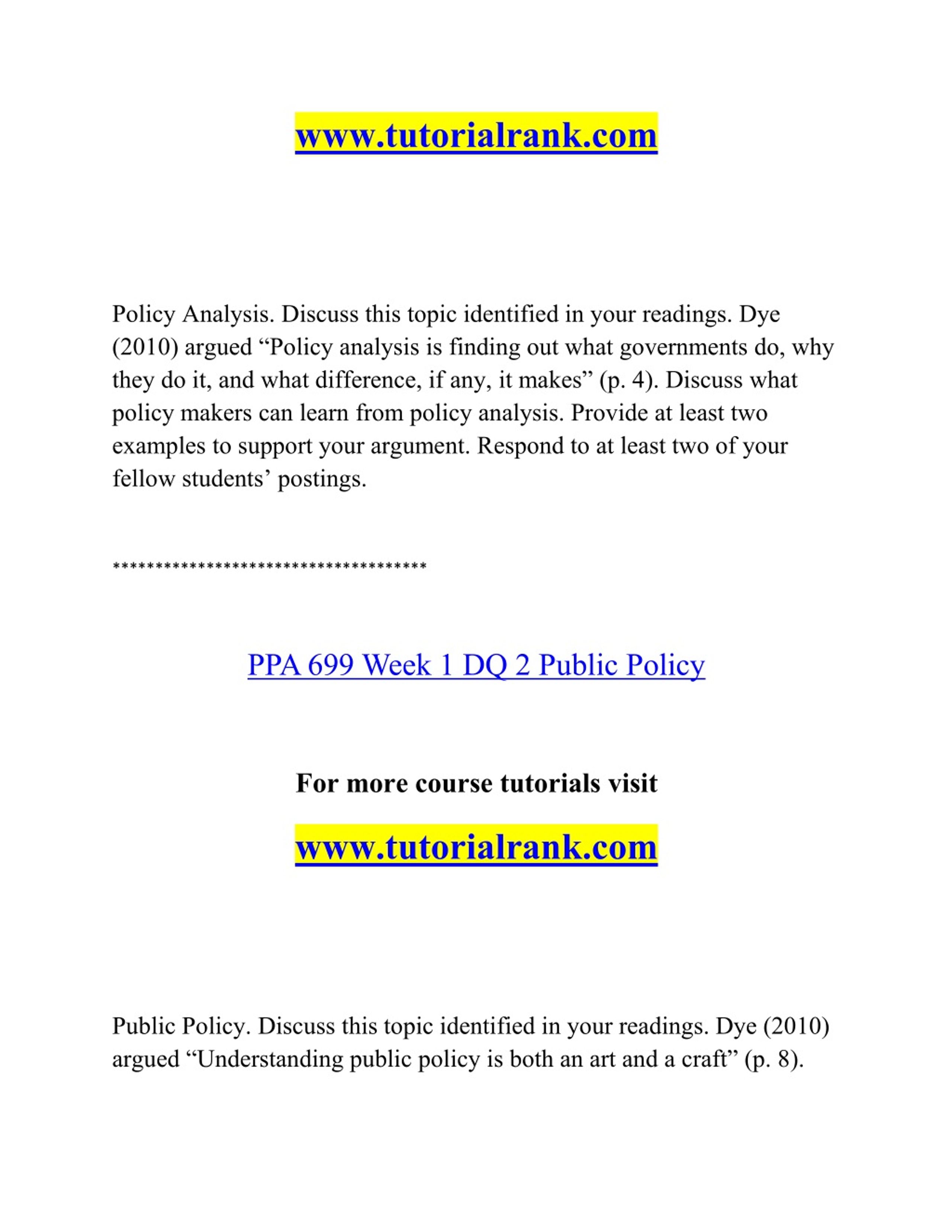 www.tutorialrank.com Policy Analysis. Discuss this topic identified in your readings. Dye (2010) argued “Policy analysis is finding out what governments do, why they do it, and what difference, if any, it makes” (p. 4). Discuss what policy makers can learn from policy analysis. Provide at least two examples to support your argument. Respond to at least two of your fellow students’ postings. ************************************* PPA699 Week 1 DQ 2 Public Policy For more course tutorials visit www.tutorialrank.com Public Policy. Discuss this topic identified in your readings. Dye (2010) argued “Understanding public policy is both an art and a craft” (p. 8).
