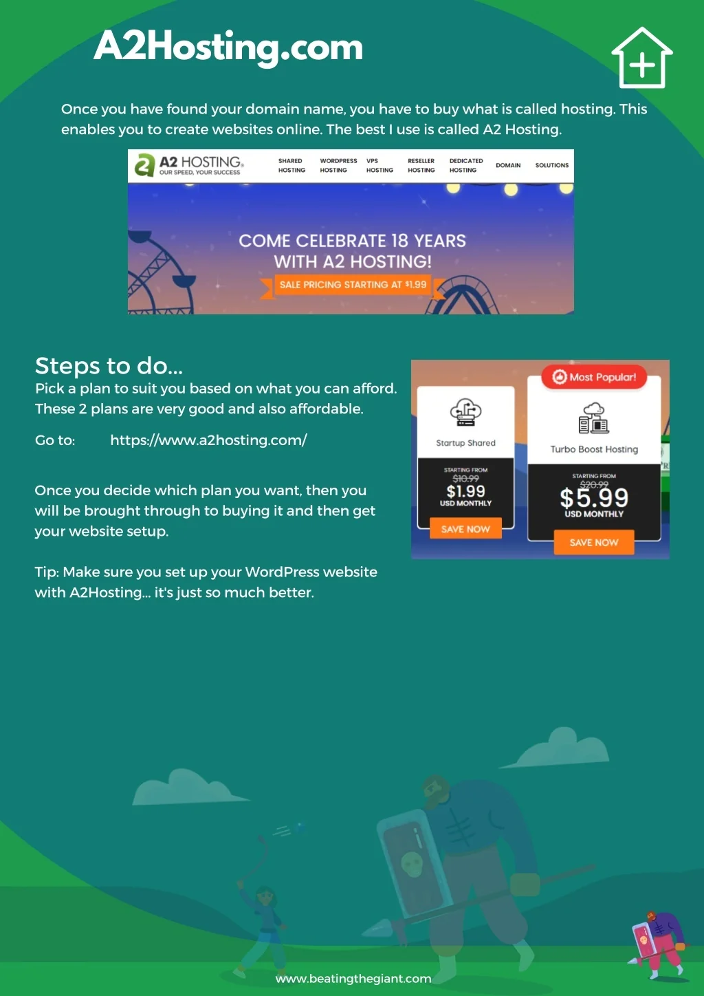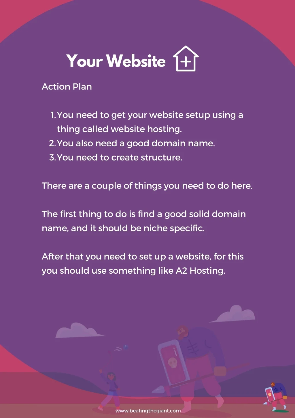 Your Website Action Plan 1. You need to get your website setup using a thing called website hosting. You also need a good domain name. You need to create structure. 2. 3. There are a couple of things you need to do here. The first thing to do is find a good solid domain name, and it should be niche specific. After that you need to set up a website, for this you should use something like A2 Hosting. www.beatingthegiant.com