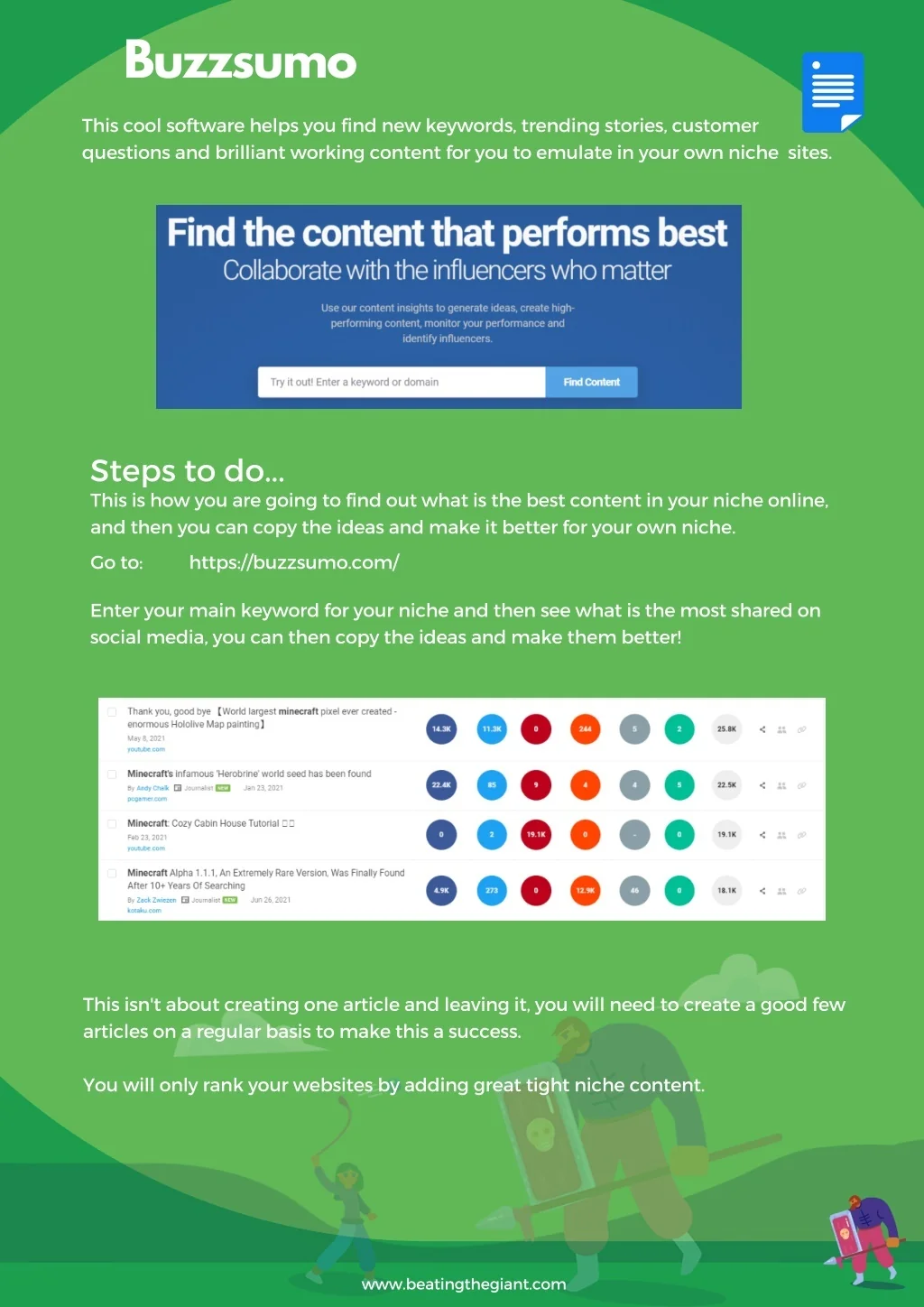 Buzzsumo This cool software helps you find new keywords, trending stories, customer questions and brilliant working content for you to emulate in your own niche sites. Steps to do... This is how you are going to find out what is the best content in your niche online, and then you can copy the ideas and make it better for your own niche. Go to: https://buzzsumo.com/ Enter your main keyword for your niche and then see what is the most shared on social media, you can then copy the ideas and make them better! This isn't about creating one article and leaving it, you will need to create a good few articles on a regular basis to make this a success. You will only rank your websites by adding great tight niche content. www.beatingthegiant.com