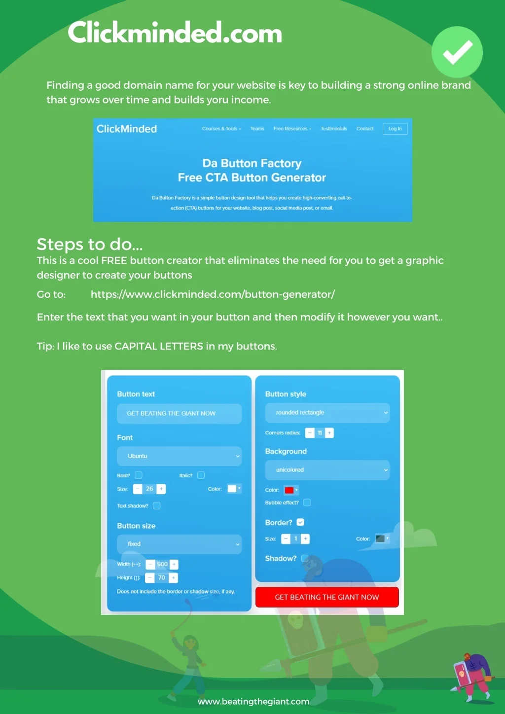 Clickminded.com Finding a good domain name for your website is key to building a strong online brand that grows over time and builds yoru income. Steps to do... This is a cool FREE button creator that eliminates the need for you to get a graphic designer to create your buttons Go to: https://www.clickminded.com/button-generator/ Enter the text that you want in your button and then modify it however you want.. Tip: I like to use CAPITAL LETTERS in my buttons. www.beatingthegiant.com