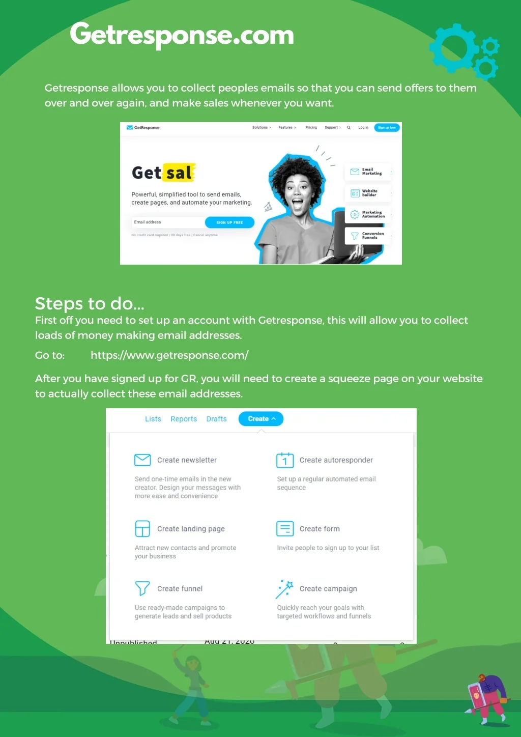 Getresponse.com Getresponse allows you to collect peoples emails so that you can send offers to them over and over again, and make sales whenever you want. Steps to do... First off you need to set up an account with Getresponse, this will allow you to collect loads of money making email addresses. Go to: https://www.getresponse.com/ After you have signed up for GR, you will need to create a squeeze page on your website to actually collect these email addresses.