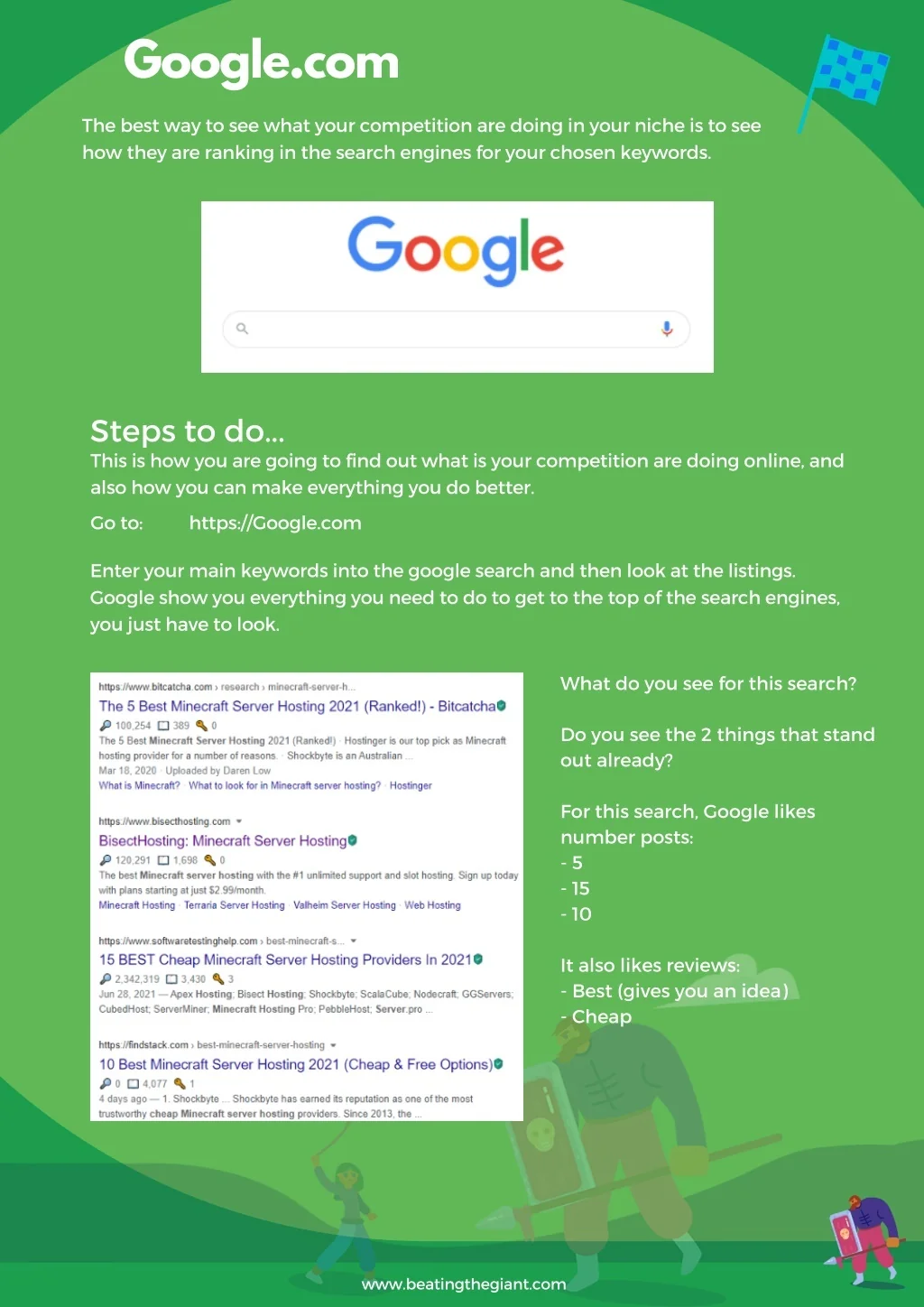 Google.com The best way to see what your competition are doing in your niche is to see how they are ranking in the search engines for your chosen keywords. Steps to do... This is how you are going to find out what is your competition are doing online, and also how you can make everything you do better. Go to: https://Google.com Enter your main keywords into the google search and then look at the listings. Google show you everything you need to do to get to the top of the search engines, you just have to look. What do you see for this search? Do you see the 2 things that stand out already? For this search, Google likes number posts: - 5 - 15 - 10 It also likes reviews: - Best (gives you an idea) - Cheap www.beatingthegiant.com