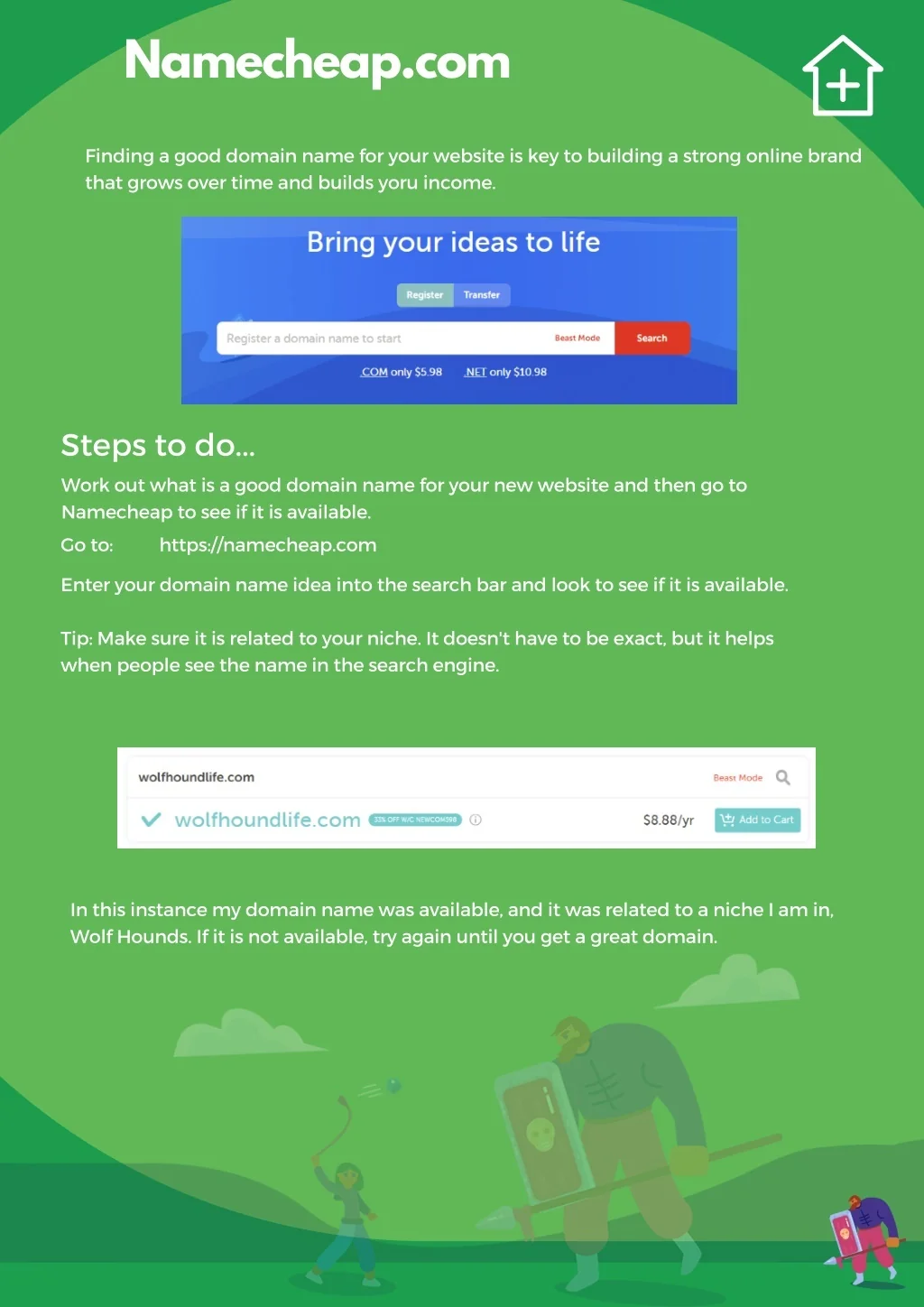 Namecheap.com Finding a good domain name for your website is key to building a strong online brand that grows over time and builds yoru income. Steps to do... Work out what is a good domain name for your new website and then go to Namecheap to see if it is available. Go to: https://namecheap.com Enter your domain name idea into the search bar and look to see if it is available. Tip: Make sure it is related to your niche. It doesn't have to be exact, but it helps when people see the name in the search engine. In this instance my domain name was available, and it was related to a niche I am in, Wolf Hounds. If it is not available, try again until you get a great domain.
