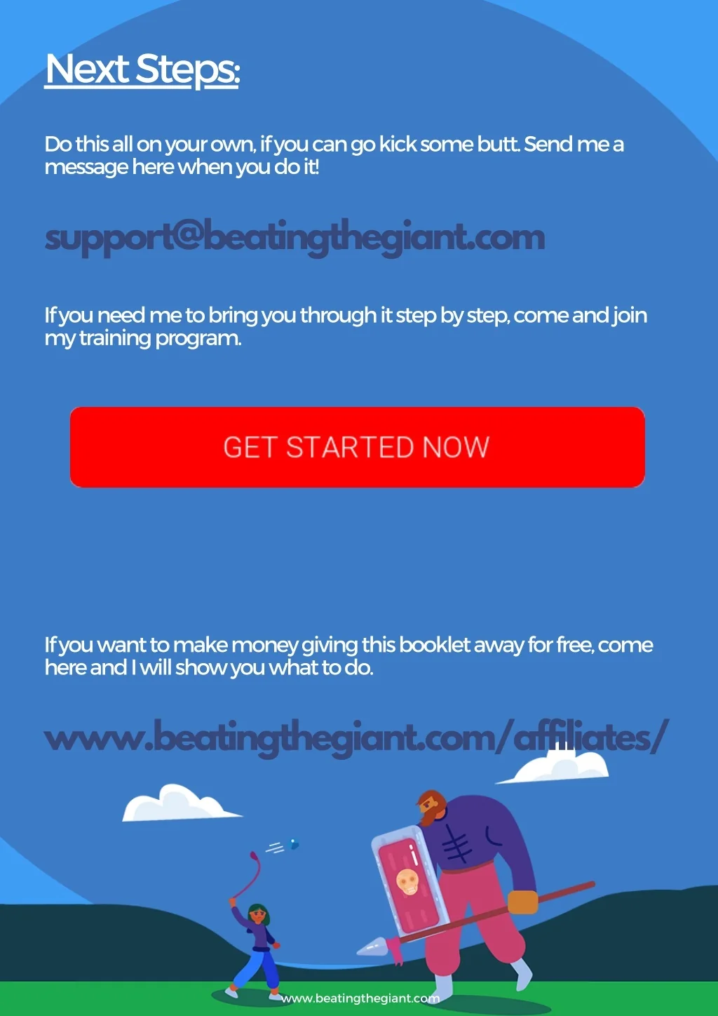 Next Steps: Do this all on your own, if you can go kick some butt. Send me a message here when you do it! support@beatingthegiant.com If you need me to bring you through it step by step, come and join my training program. If you want to make money giving this booklet away for free, come here and I will show you what to do. www.beatingthegiant.com/affiliates/ www.beatingthegiant.com
