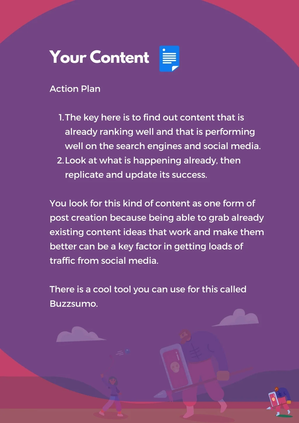 Your Content Action Plan 1. The key here is to find out content that is already ranking well and that is performing well on the search engines and social media. Look at what is happening already, then replicate and update its success. 2. You look for this kind of content as one form of post creation because being able to grab already existing content ideas that work and make them better can be a key factor in getting loads of traffic from social media. There is a cool tool you can use for this called Buzzsumo.