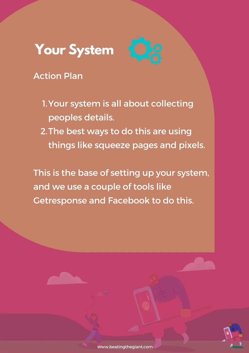 Your System Action Plan 1. Your system is all about collecting peoples details. The best ways to do this are using things like squeeze pages and pixels. 2. This is the base of setting up your system, and we use a couple of tools like Getresponse and Facebook to do this. www.beatingthegiant.com