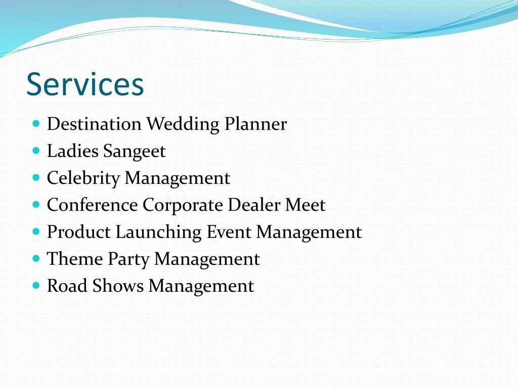 Services • Destination Wedding Planner • Ladies Sangeet • Celebrity Management • Conference Corporate Dealer Meet • Product Launching Event Management • Theme Party Management • Road Shows Management