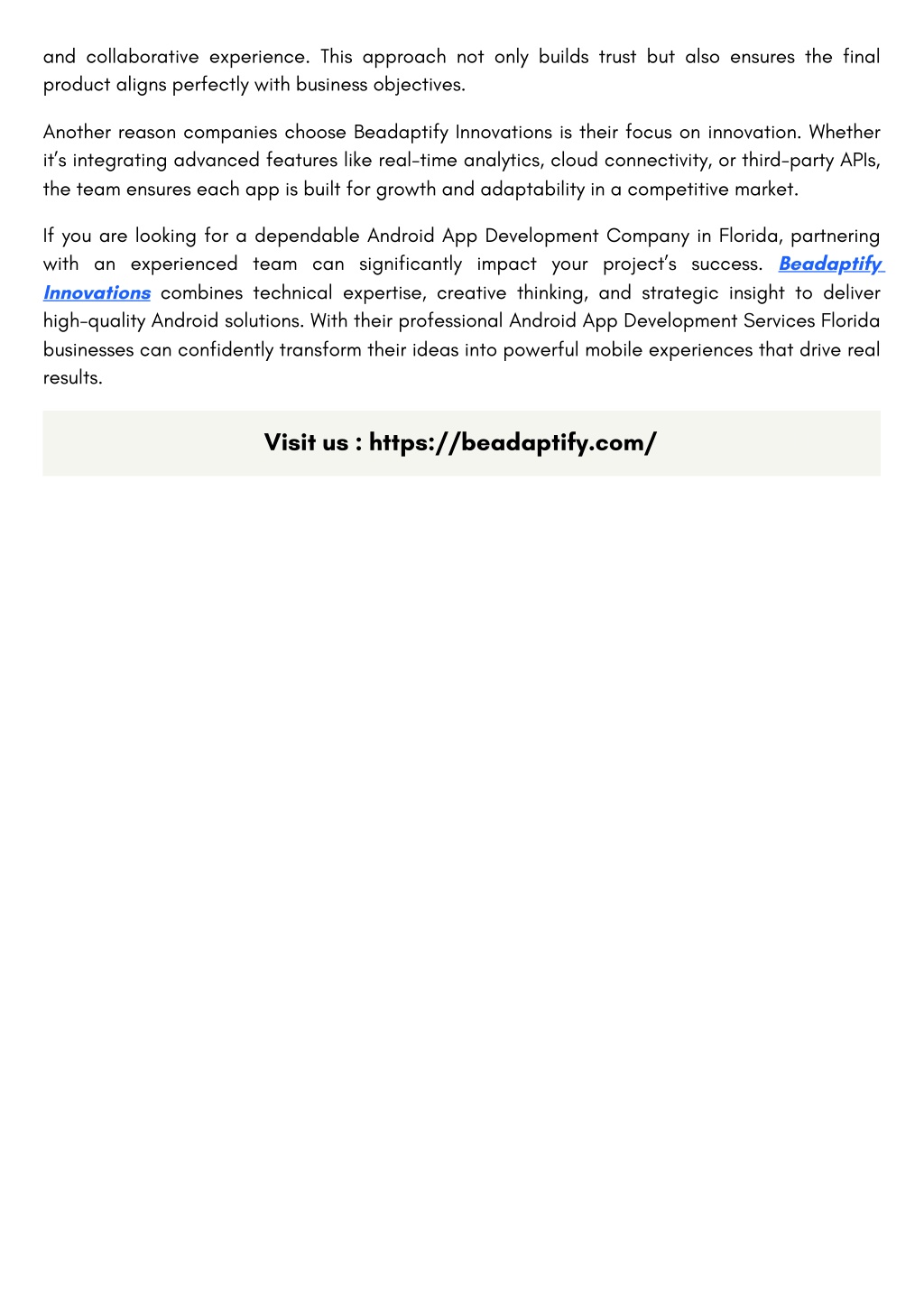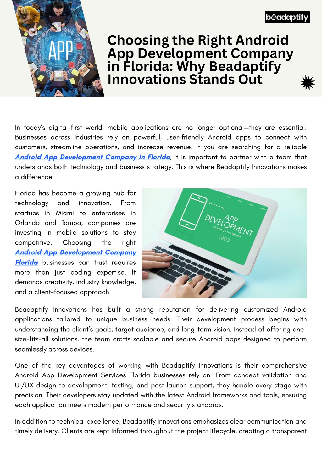 and collaborative experience. This approach not only builds trust but also ensures the final product aligns perfectly with business objectives. Another reason companies choose Beadaptify Innovations is their focus on innovation. Whether it’s integrating advanced features like real-time analytics, cloud connectivity, or third-party APIs, the team ensures each app is built for growth and adaptability in a competitive market. If you are looking for a dependable Android App Development Company in Florida, partnering with an experienced team can significantly impact your project’s success. Beadaptify Innovations combines technical expertise, creative thinking, and strategic insight to deliver high-quality Android solutions. With their professional Android App Development Services Florida businesses can confidently transform their ideas into powerful mobile experiences that drive real results. Visit us : https://beadaptify.com/