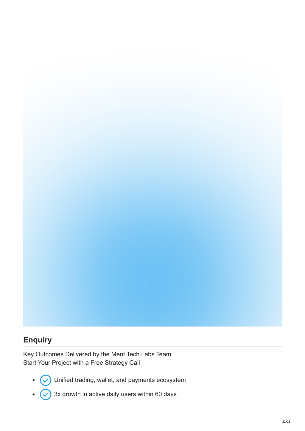 Enquiry Key Outcomes Delivered by the Ment Tech Labs Team Start Your Project with a Free Strategy Call Unified trading, wallet, and payments ecosystem 3x growth in active daily users within 60 days 22/23