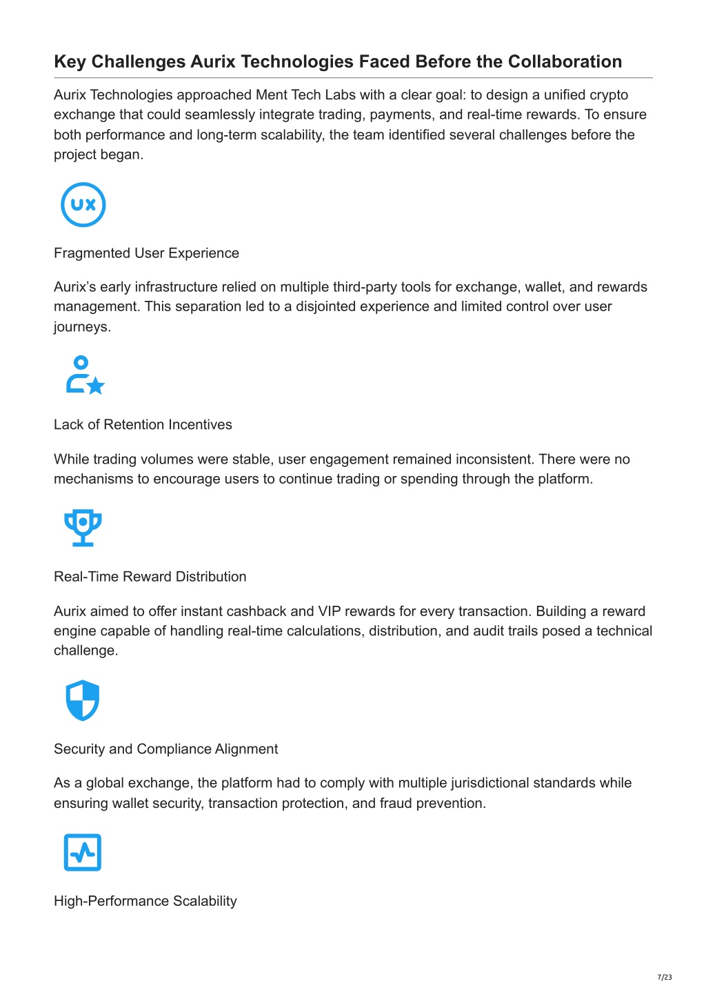 Key Challenges Aurix Technologies Faced Before the Collaboration Aurix Technologies approached Ment Tech Labs with a clear goal: to design a unified crypto exchange that could seamlessly integrate trading, payments, and real-time rewards. To ensure both performance and long-term scalability, the team identified several challenges before the project began. Fragmented User Experience Aurix’s early infrastructure relied on multiple third-party tools for exchange, wallet, and rewards management. This separation led to a disjointed experience and limited control over user journeys. Lack of Retention Incentives While trading volumes were stable, user engagement remained inconsistent. There were no mechanisms to encourage users to continue trading or spending through the platform. Real-Time Reward Distribution Aurix aimed to offer instant cashback and VIP rewards for every transaction. Building a reward engine capable of handling real-time calculations, distribution, and audit trails posed a technical challenge. Security and Compliance Alignment As a global exchange, the platform had to comply with multiple jurisdictional standards while ensuring wallet security, transaction protection, and fraud prevention. High-Performance Scalability 7/23