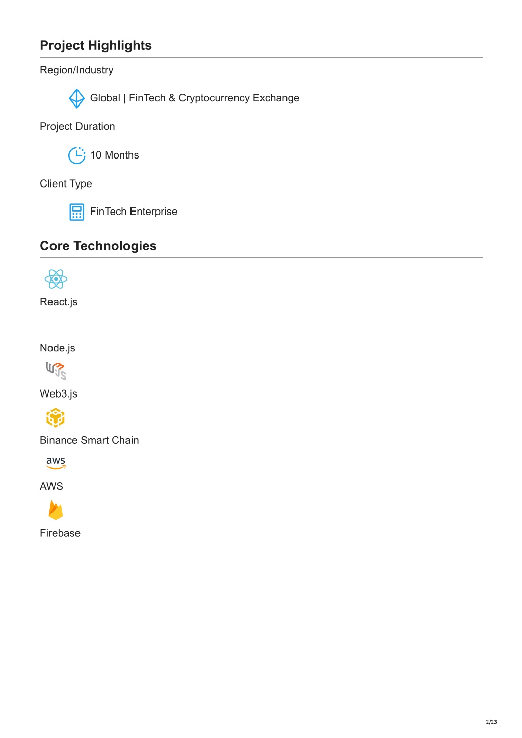 Project Highlights Region/Industry Global | FinTech & Cryptocurrency Exchange Project Duration 10 Months Client Type FinTech Enterprise Core Technologies React.js Node.js Web3.js Binance Smart Chain AWS Firebase 2/23
