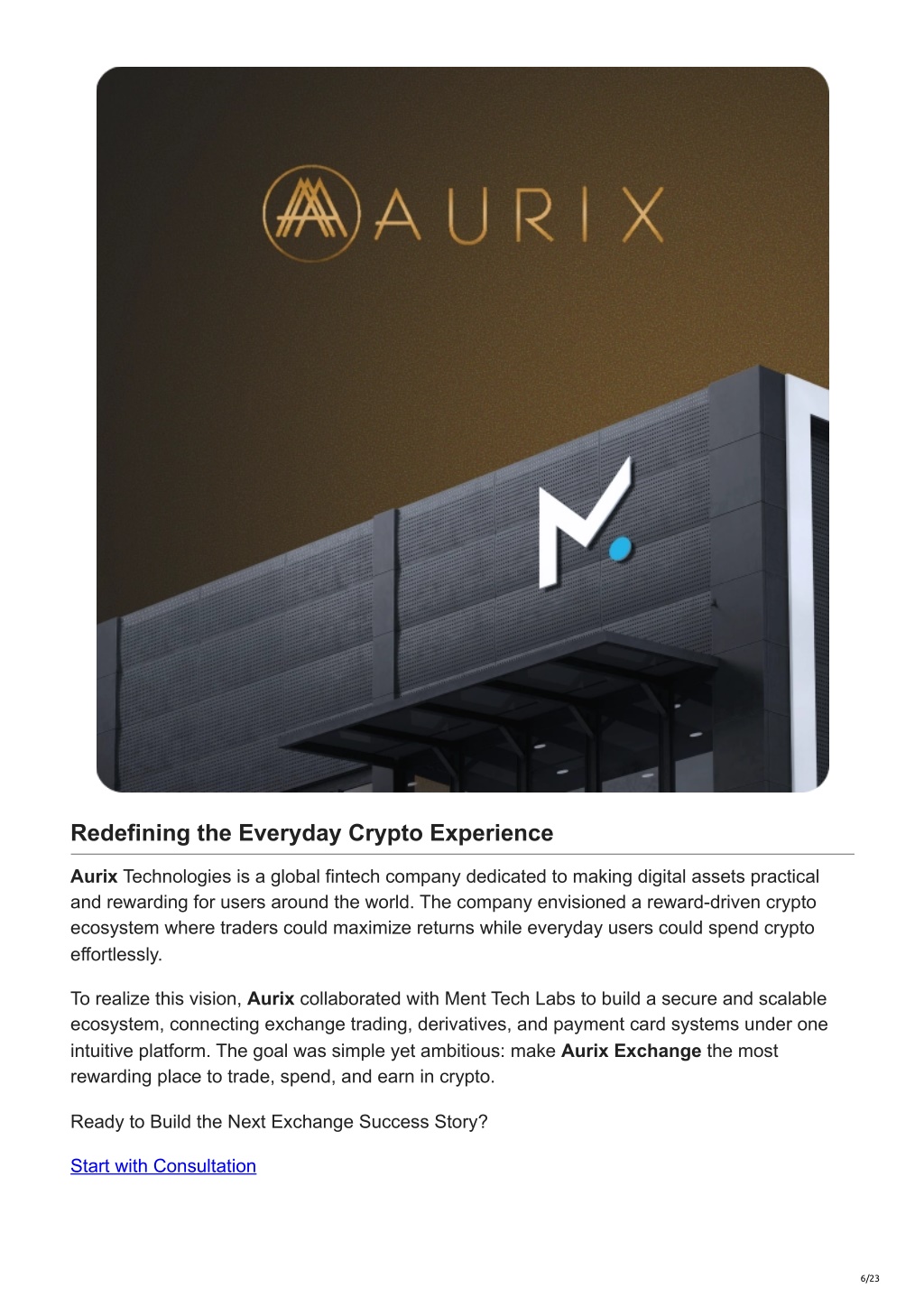 Aurix Exchange Case Study: Trading, Rewards & Payments ment.tech/case-study/aurix-exchange October 9, 2025 Aurix Exchange A Unified Crypto Platform Built for Trading, Earning, and Everyday Spending Ment Tech Labs partnered with Aurix Technologies to create an all-in-one exchan ge where users can buy, sell, trade, and spend cryptocurrencies while earning rewards in real time. Designed for global adoption, Aurix Exchange merges professional trading tools with cashback programs and seamless payment card integration, bringing utility and trust back to digital assets. Talk to Our Experts 1/23