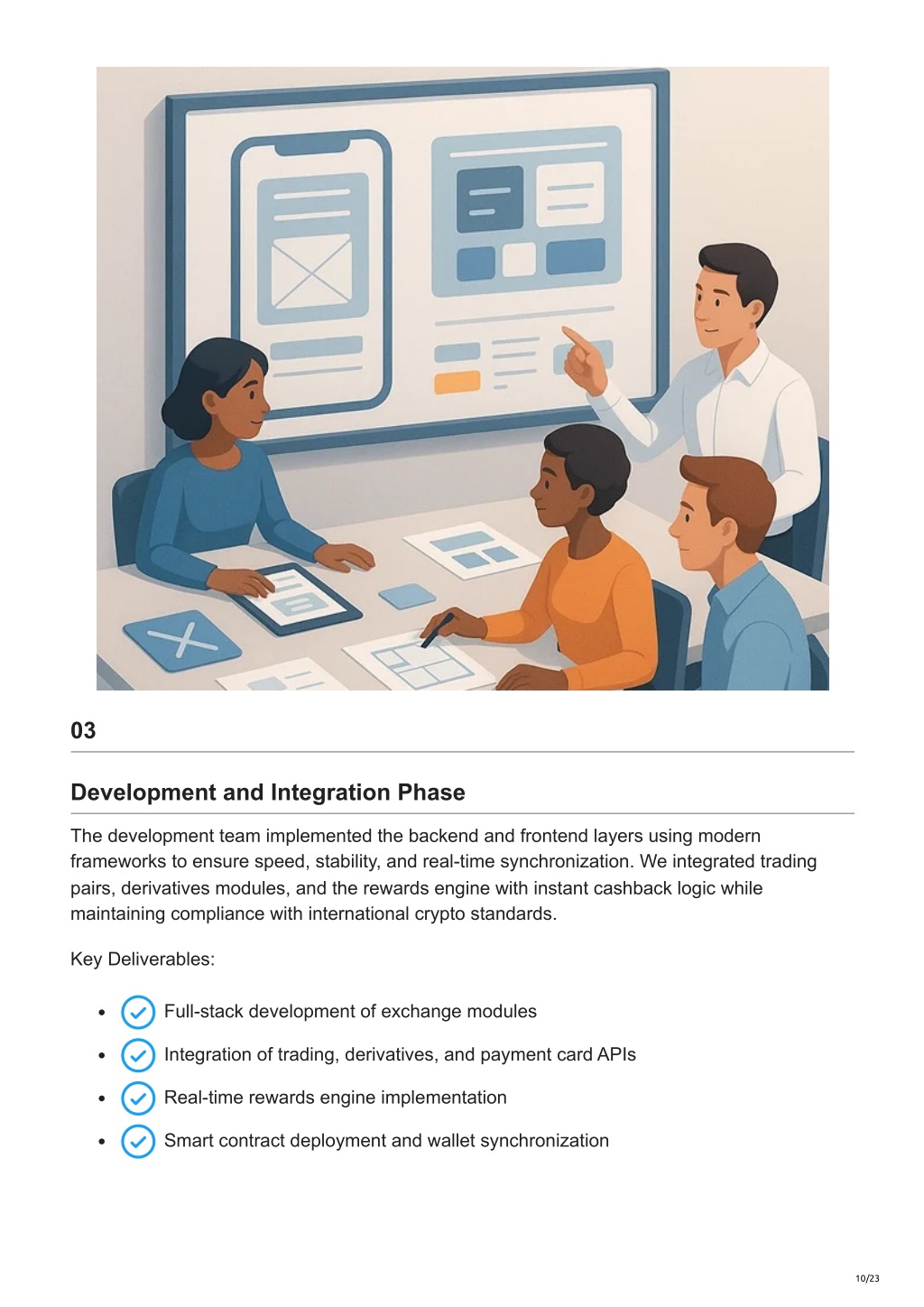 03 Development and Integration Phase The development team implemented the backend and frontend layers using modern frameworks to ensure speed, stability, and real-time synchronization. We integrated trading pairs, derivatives modules, and the rewards engine with instant cashback logic while maintaining compliance with international crypto standards. Key Deliverables: Full-stack development of exchange modules Integration of trading, derivatives, and payment card APIs Real-time rewards engine implementation Smart contract deployment and wallet synchronization 10/23