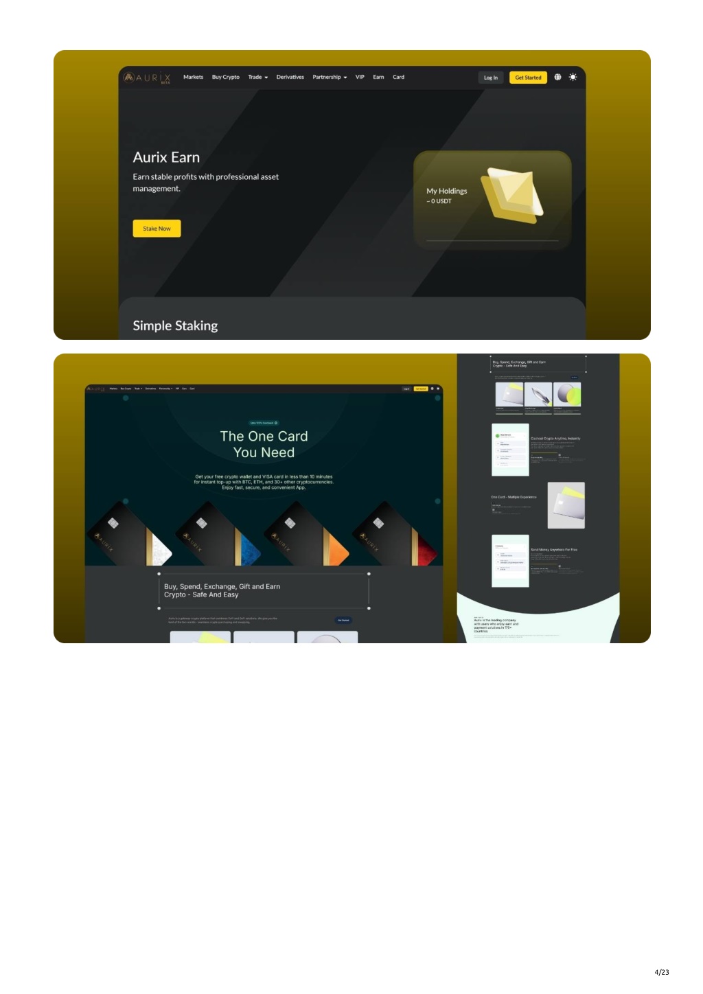 A custom-built cashback and VIP reward system that automatically calculates and distributes rewards across user accounts instantly after each trade or purchase. Multi-Module Wallet System Secure wallets with on-chain and off-chain capabilities, supporting instant deposits, withdrawals, and reward credits in real time. Aurix Payment Card Integration Linked debit card functionality that allowed users to spend crypto on everyday purchases and earn up to 9% cashback. Unified User Dashboard A central interface combining trading history, reward tracking, and wallet balance overview, simplifying financial management for users.and fiat on-ramps. Dynamic VIP Program Tiered user levels based on transaction volume and card spending, enhancing engagement through progressive benefits. Liquidity and Market Data Integration Real-time market charts, depth data, and price tracking powered by exchange-grade APIs. 13/23