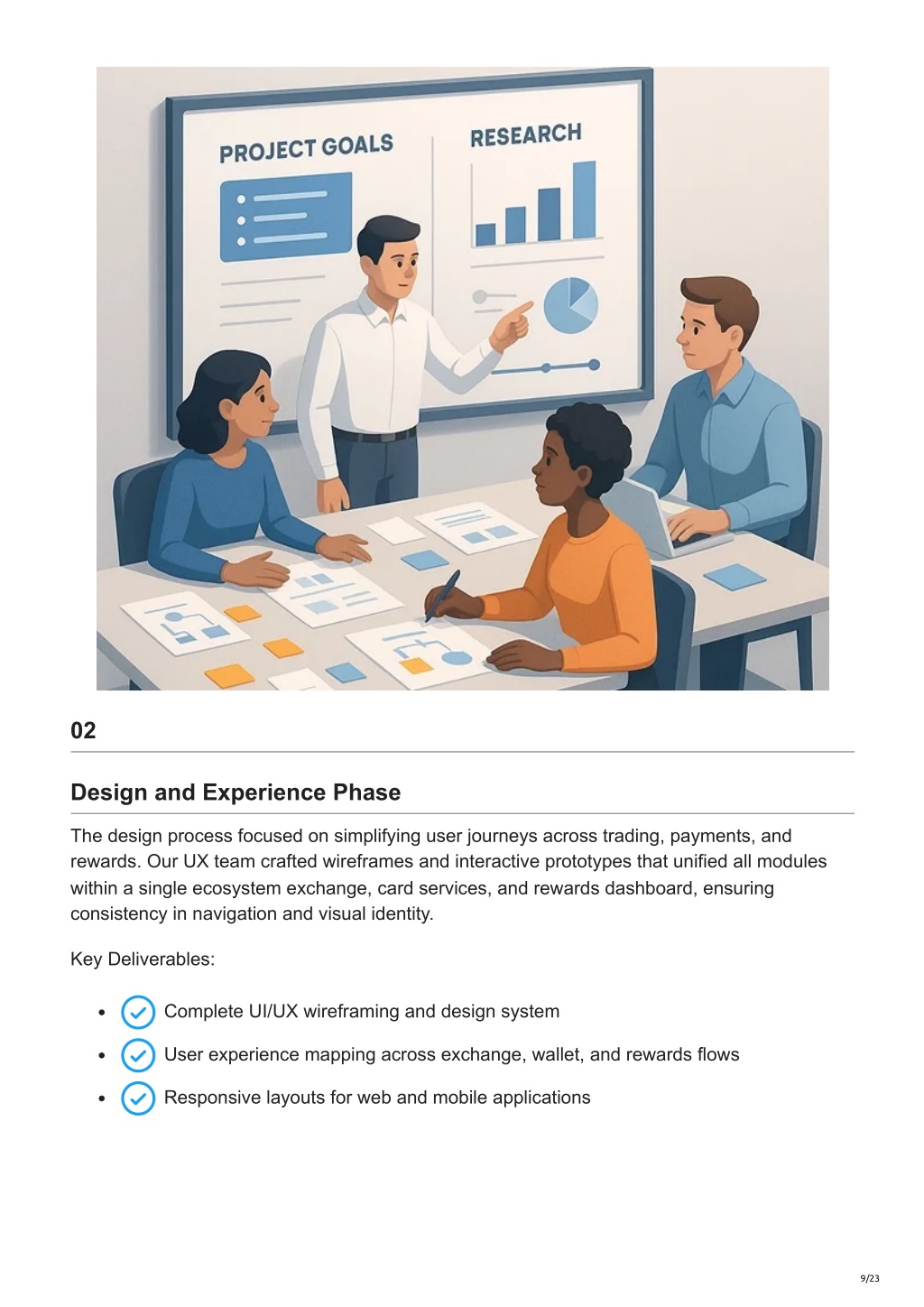 02 Design and Experience Phase The design process focused on simplifying user journeys across trading, payments, and rewards. Our UX team crafted wireframes and interactive prototypes that unified all modules within a single ecosystem exchange, card services, and rewards dashboard, ensuring consistency in navigation and visual identity. Key Deliverables: Complete UI/UX wireframing and design system User experience mapping across exchange, wallet, and rewards flows Responsive layouts for web and mobile applications 9/23