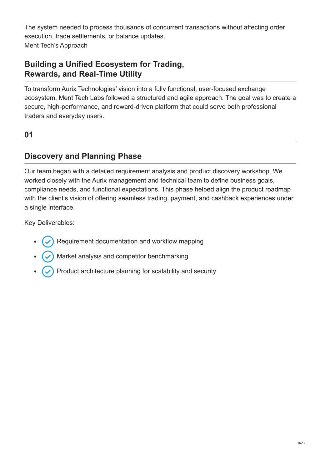 The system needed to process thousands of concurrent transactions without affecting order execution, trade settlements, or balance updates. Ment Tech’s Approach Building a Unified Ecosystem for Trading, Rewards, and Real-Time Utility To transform Aurix Technologies’ vision into a fully functional, user-focused exchange ecosystem, Ment Tech Labs followed a structured and agile approach. The goal was to create a secure, high-performance, and reward-driven platform that could serve both professional traders and everyday users. 01 Discovery and Planning Phase Our team began with a detailed requirement analysis and product discovery workshop. We worked closely with the Aurix management and technical team to define business goals, compliance needs, and functional expectations. This phase helped align the product roadmap with the client’s vision of offering seamless trading, payment, and cashback experiences under a single interface. Key Deliverables: Requirement documentation and workflow mapping Market analysis and competitor benchmarking Product architecture planning for scalability and security 8/23