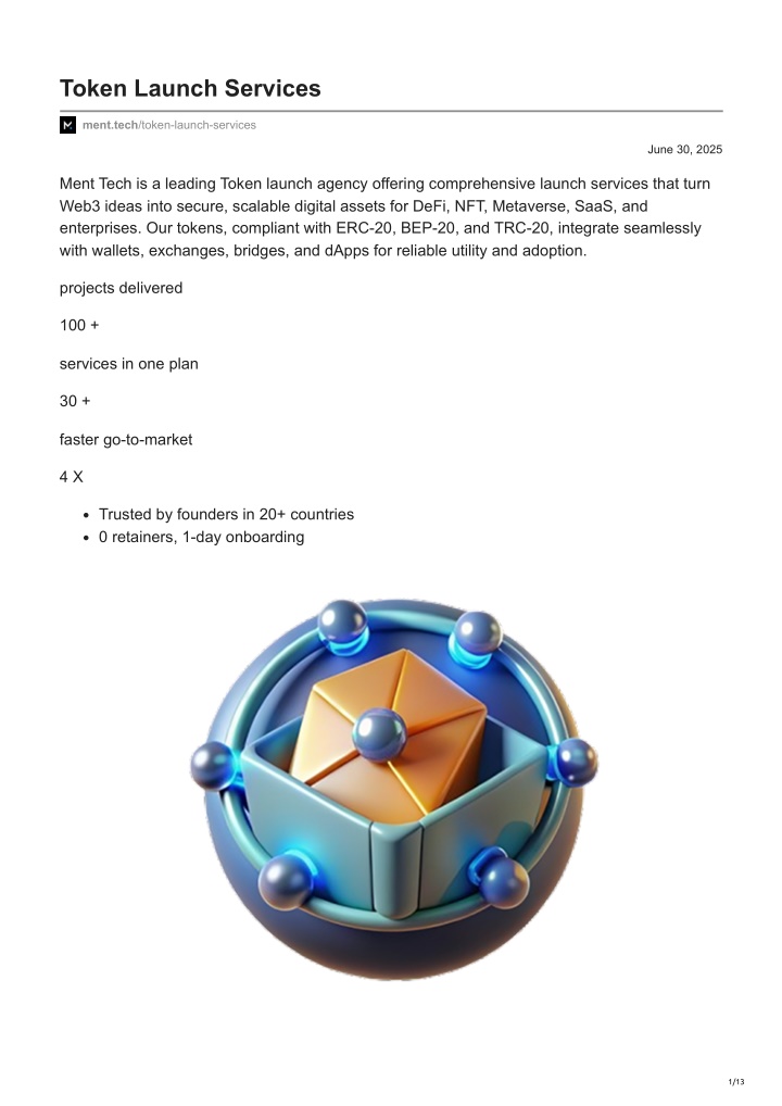 Token Launch Services ment.tech/token-launch-services June 30, 2025 Ment Tech is a leading Token launch agency offering comprehensive launch services that turn Web3 ideas into secure, scalable digital assets for DeFi, NFT, Metaverse, SaaS, and enterprises. Our tokens, compliant with ERC-20, BEP-20, and TRC-20, integrate seamlessly with wallets, exchanges, bridges, and dApps for reliable utility and adoption. projects delivered 100 + services in one plan 30 + faster go-to-market 4 X Trusted by founders in 20+ countries 0 retainers, 1-day onboarding 1/13